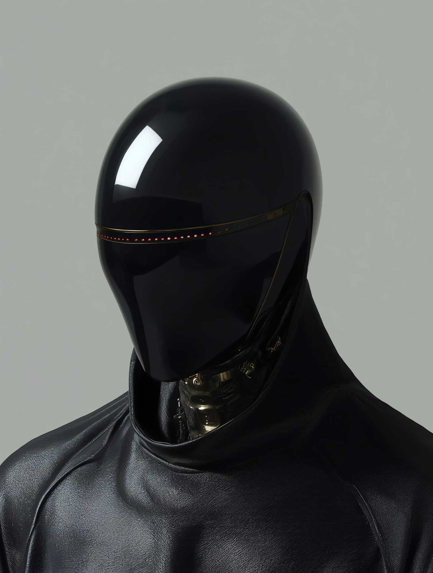 Futuristic humanoid figure with a sleek black helmet, red light accents, and a leather-like outfit against a neutral gray background.