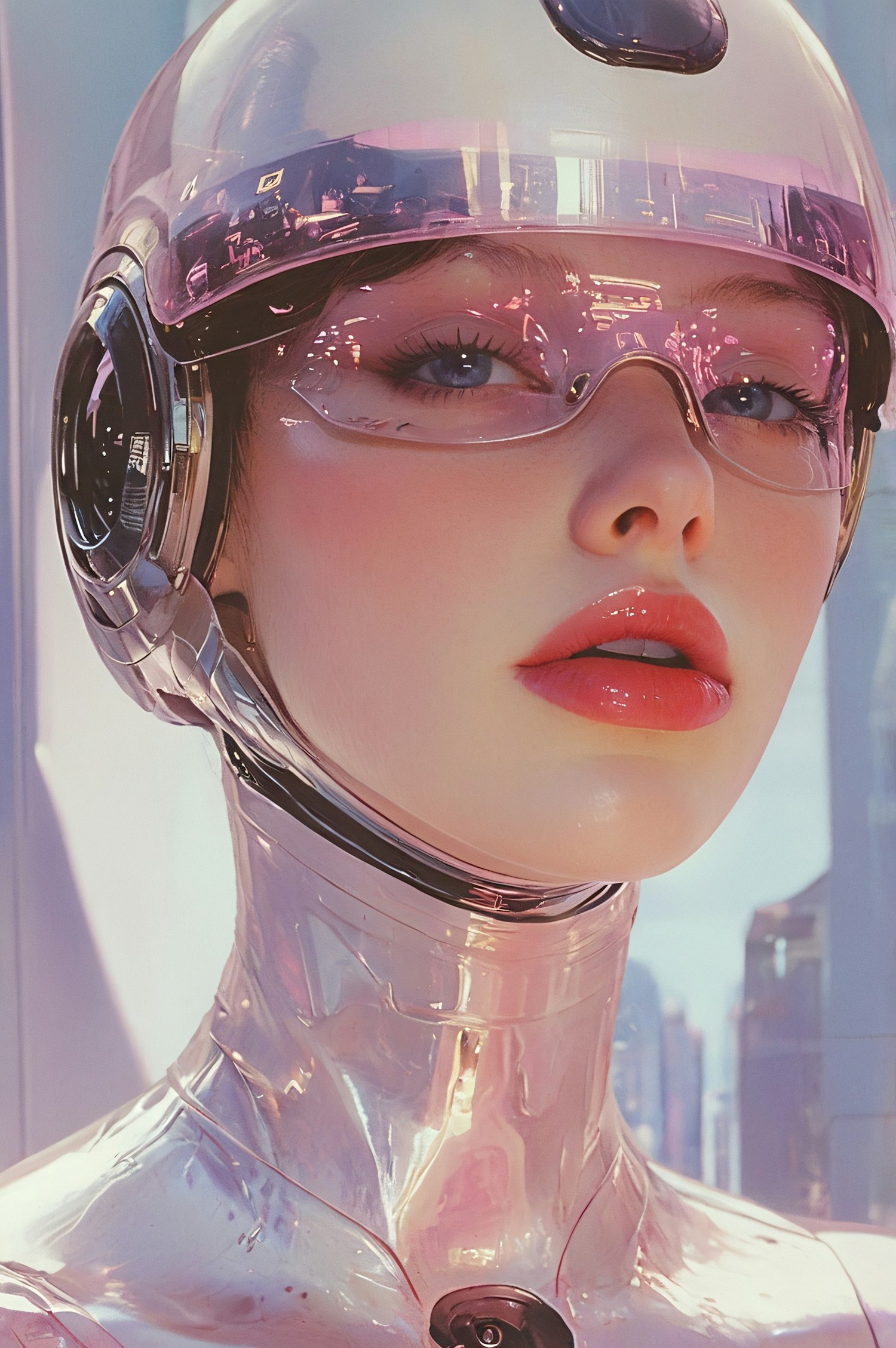 Futuristic humanoid with metallic design, translucent helmet, glossy pink lips, and blue eyes in a modern cityscape.