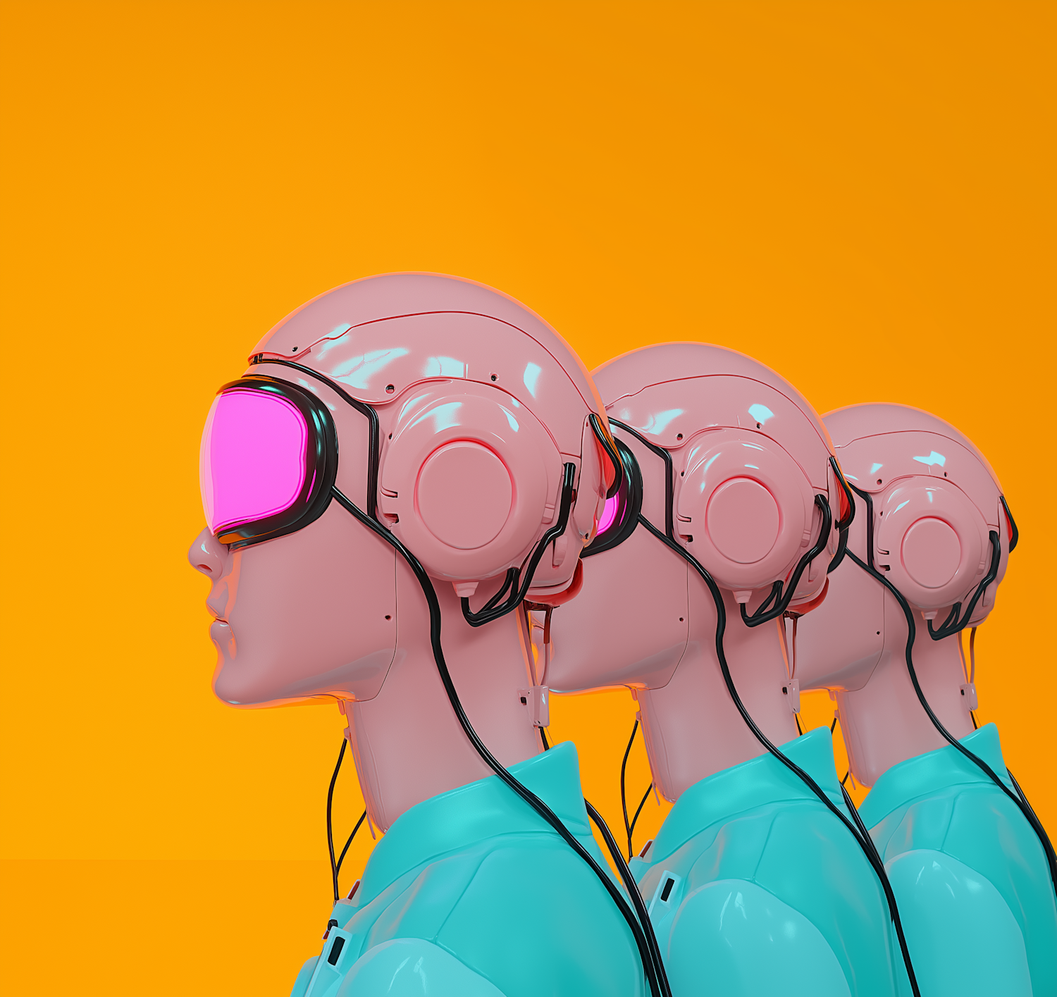 Futuristic humanoid figures with pink visors and teal attire against a vibrant orange background, showcasing a modern tech aesthetic.