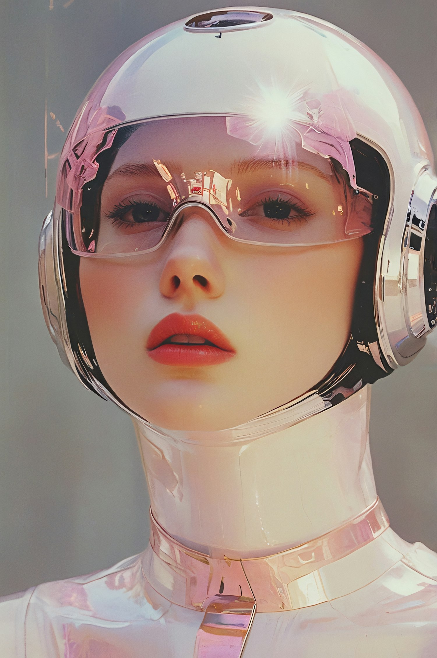 Futuristic humanoid with sleek metallic helmet and visor, blending technology and beauty in a modern, high-tech aesthetic.
