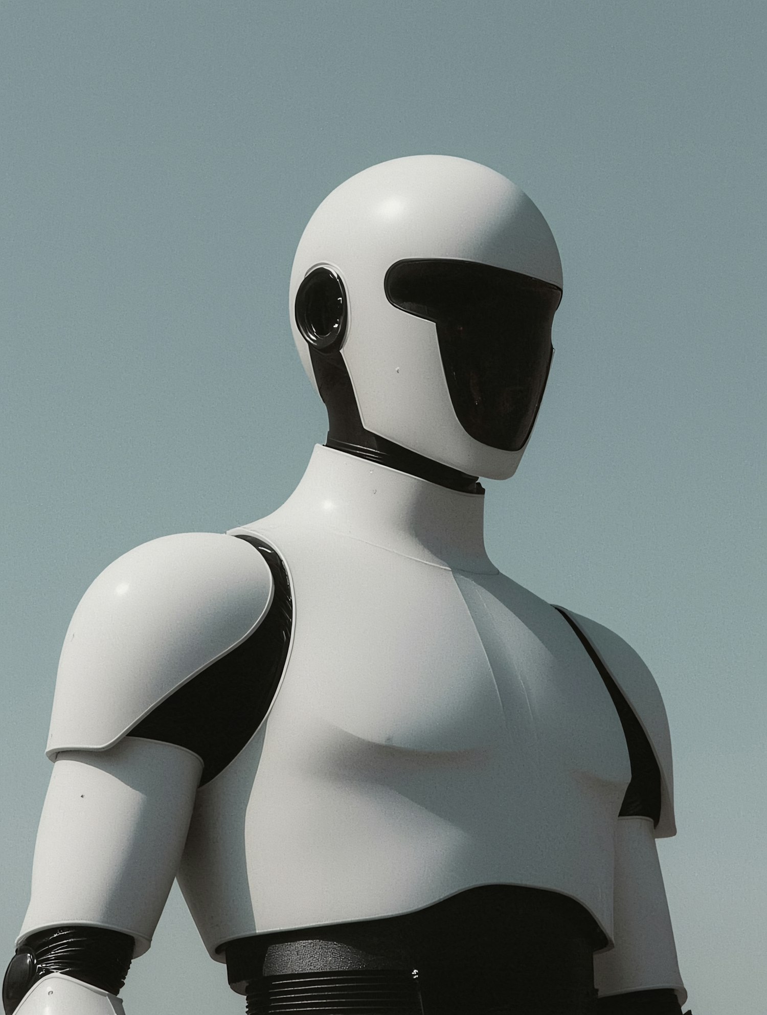 A sleek humanoid robot with a futuristic white and black design stands against a clear blue sky, showcasing advanced technology.