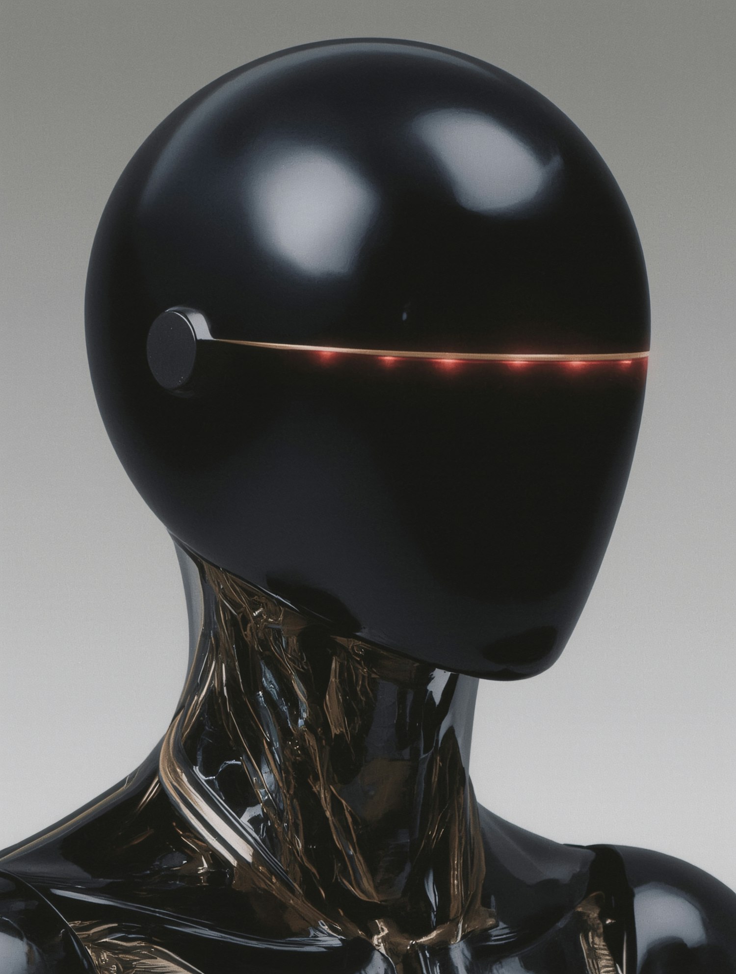 Futuristic black humanoid robot with a sleek design and glowing red visor, showcasing advanced technology and modern aesthetics.