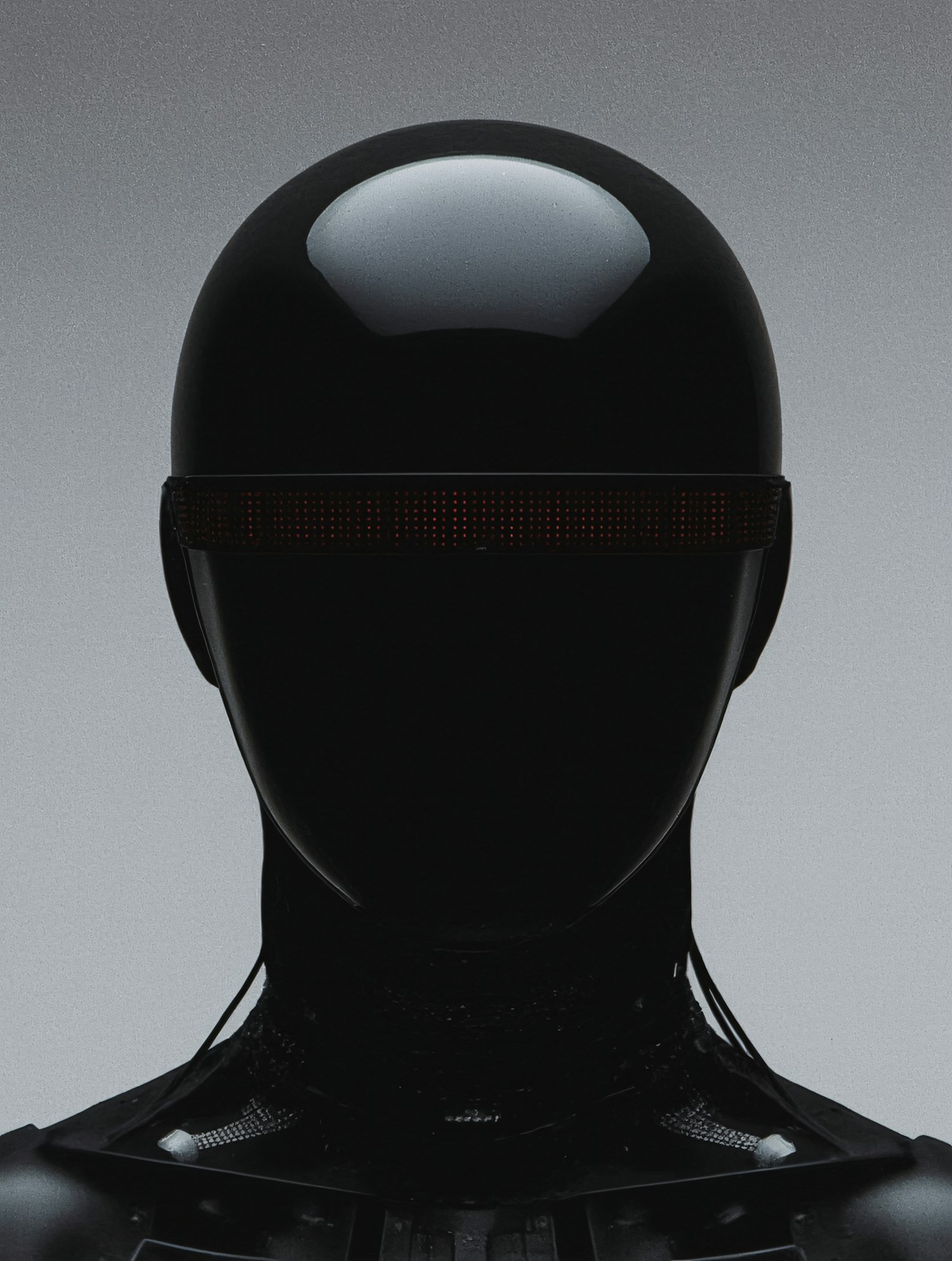 Futuristic humanoid robot with a glossy black finish and a red light strip on its faceplate, set against a neutral gray background.