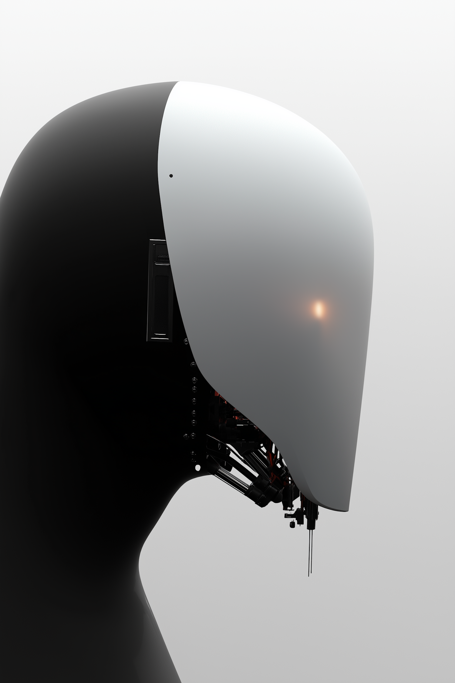 Minimalist humanoid robot with a sleek white and black design, showcasing intricate internal mechanics against a soft gradient background.
