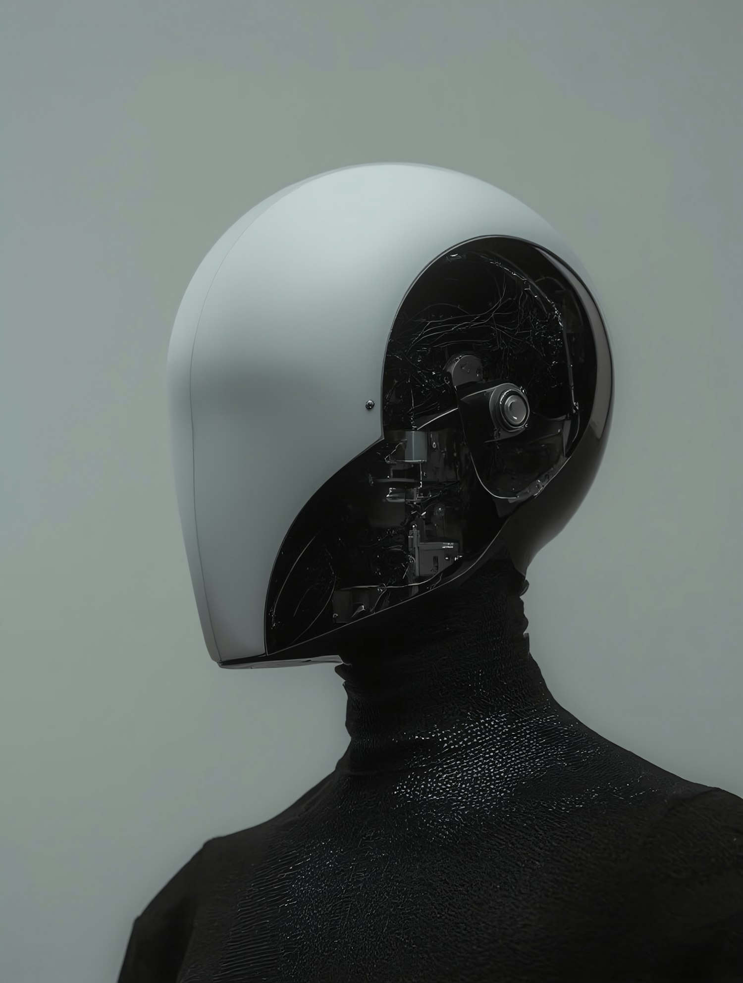 A sleek humanoid robot with a white helmet-like head, partially revealing intricate internal mechanisms, set against a neutral background.