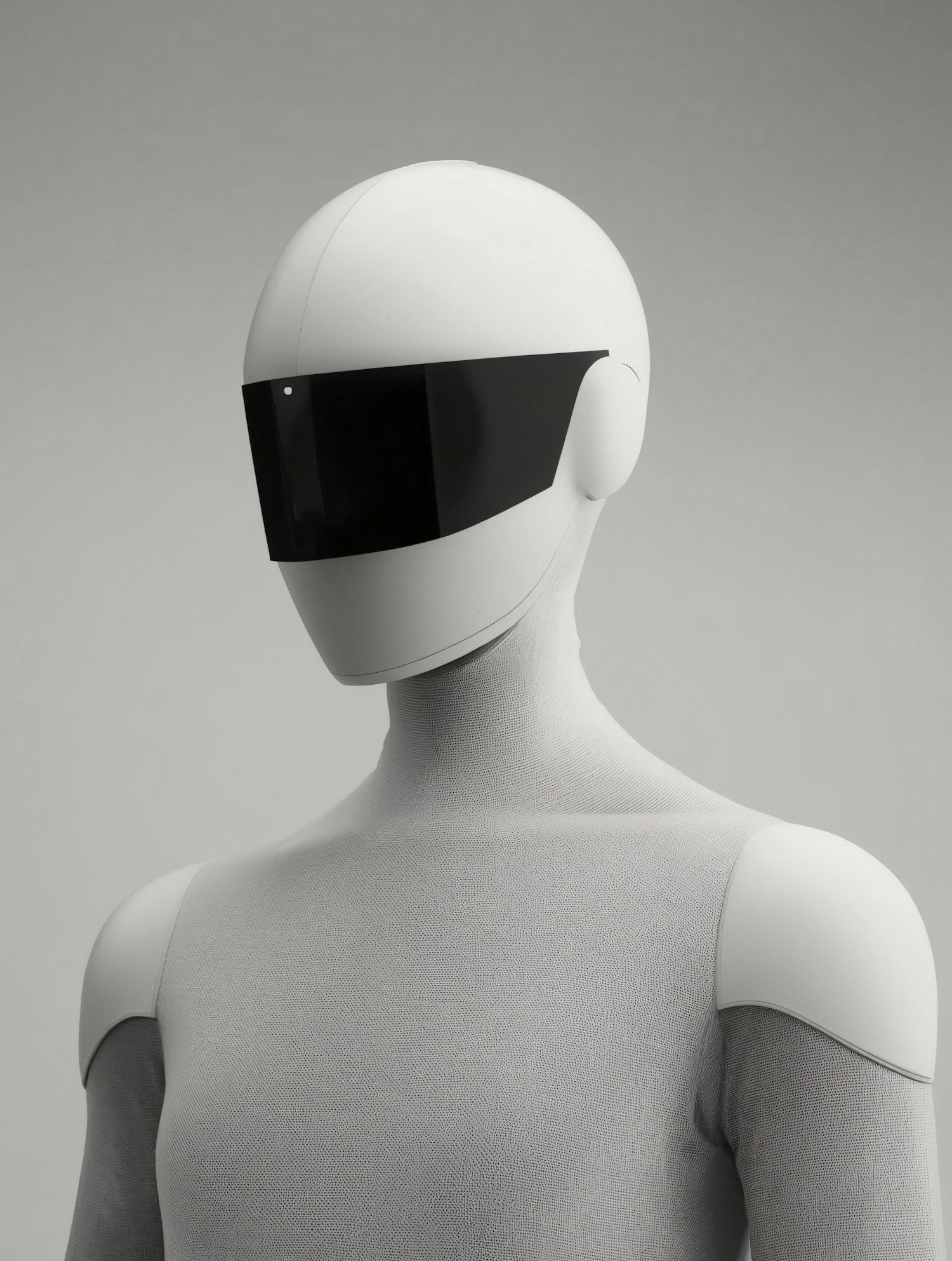 Futuristic humanoid robot with a sleek white design, black visor, and textured gray body, set against a neutral gray background.