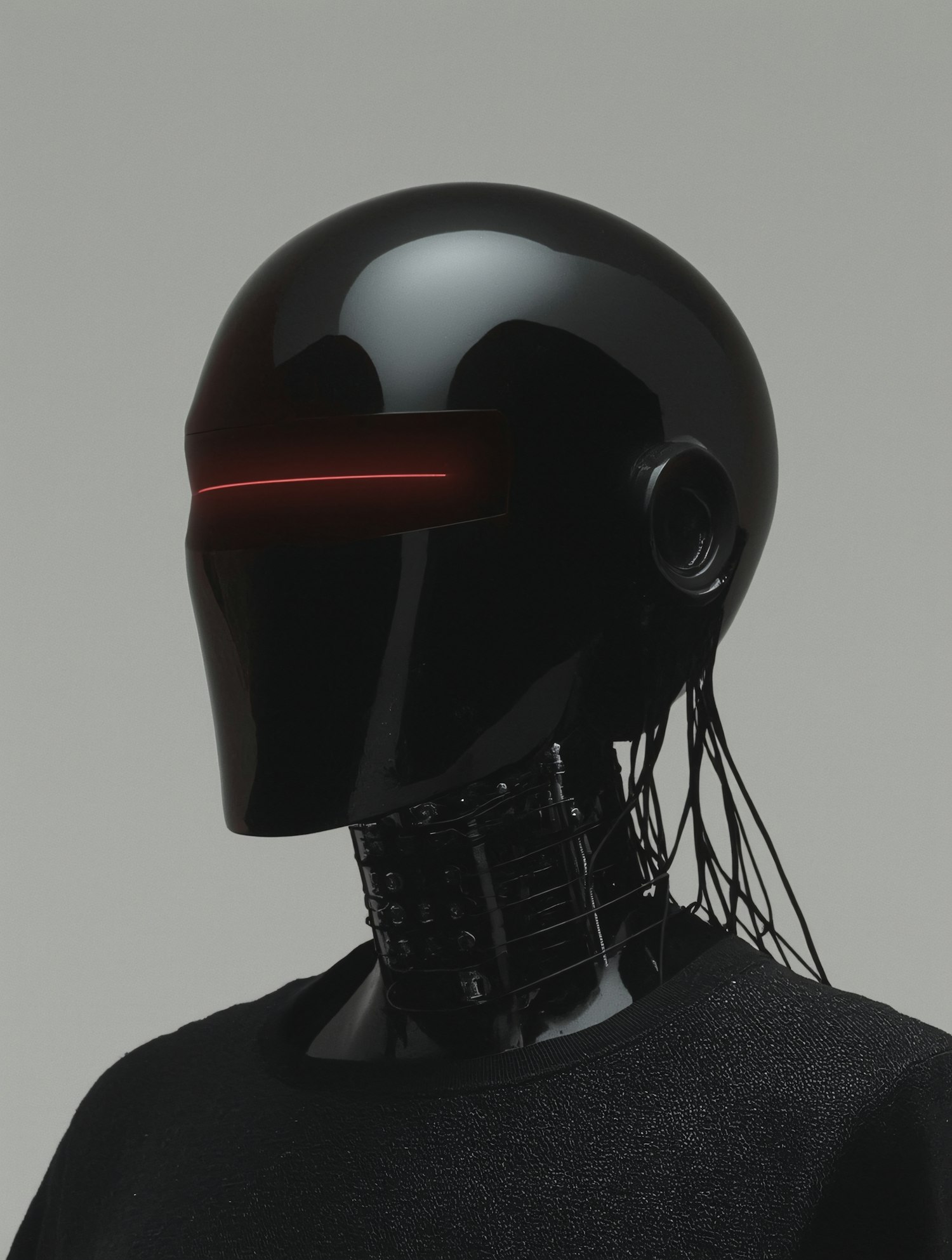 Futuristic humanoid robot with a glossy black head, red visor light, and visible mechanical neck components against a neutral background.