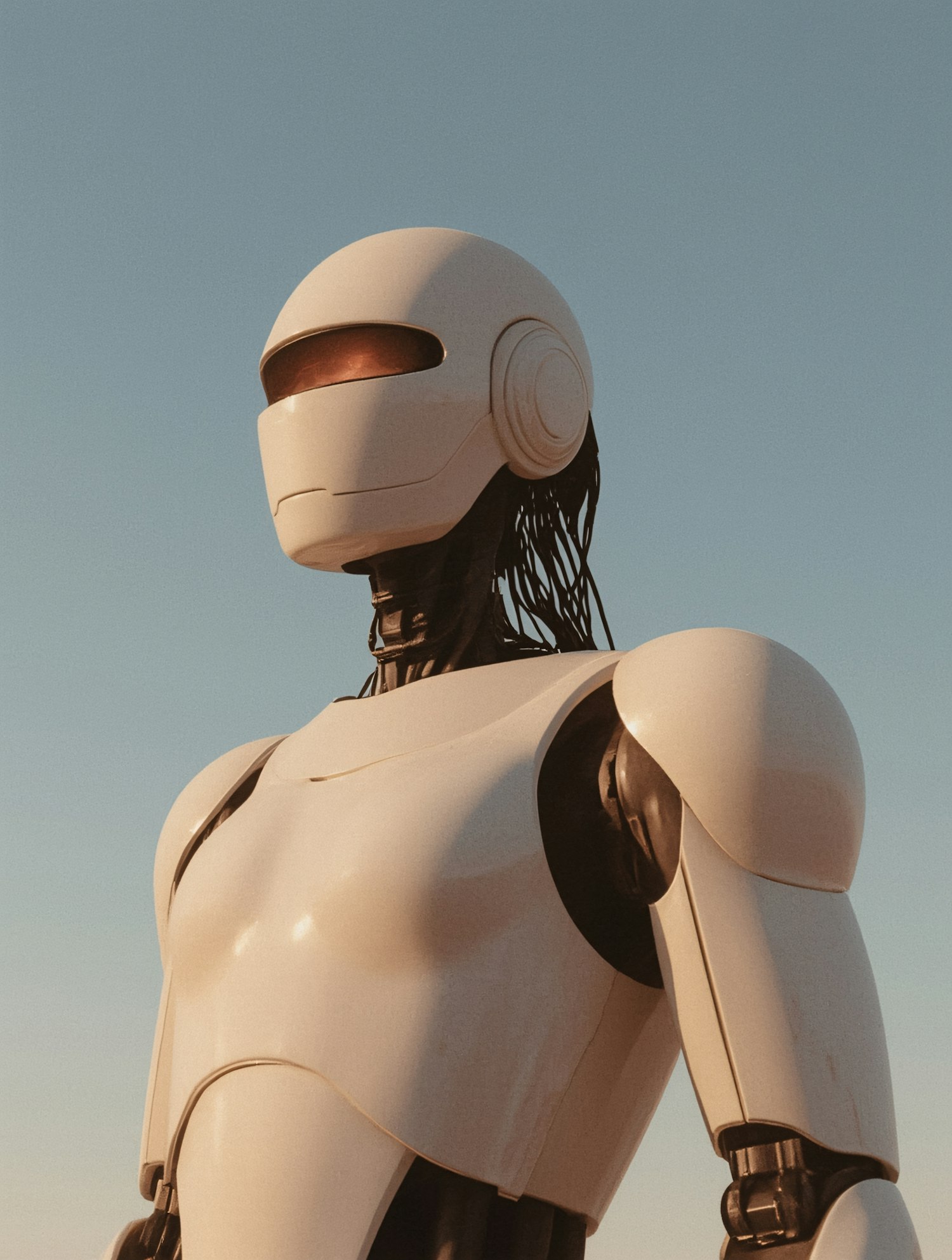 A futuristic humanoid robot with a sleek white design stands against a clear blue sky, showcasing advanced technology and aesthetics.