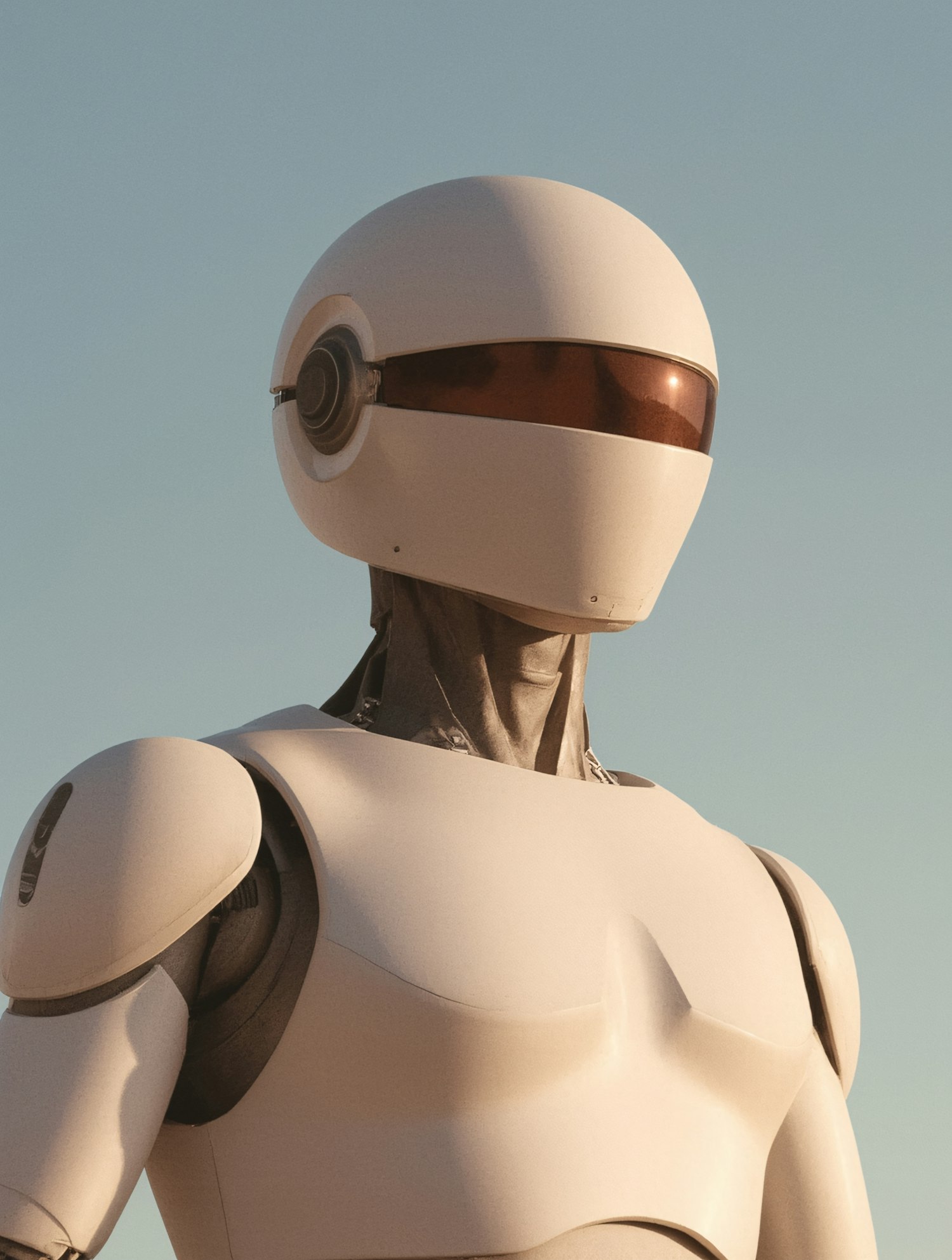A sleek humanoid robot with a white exterior and a visor-like headpiece, set against a clear blue sky. Futuristic and minimalist design.