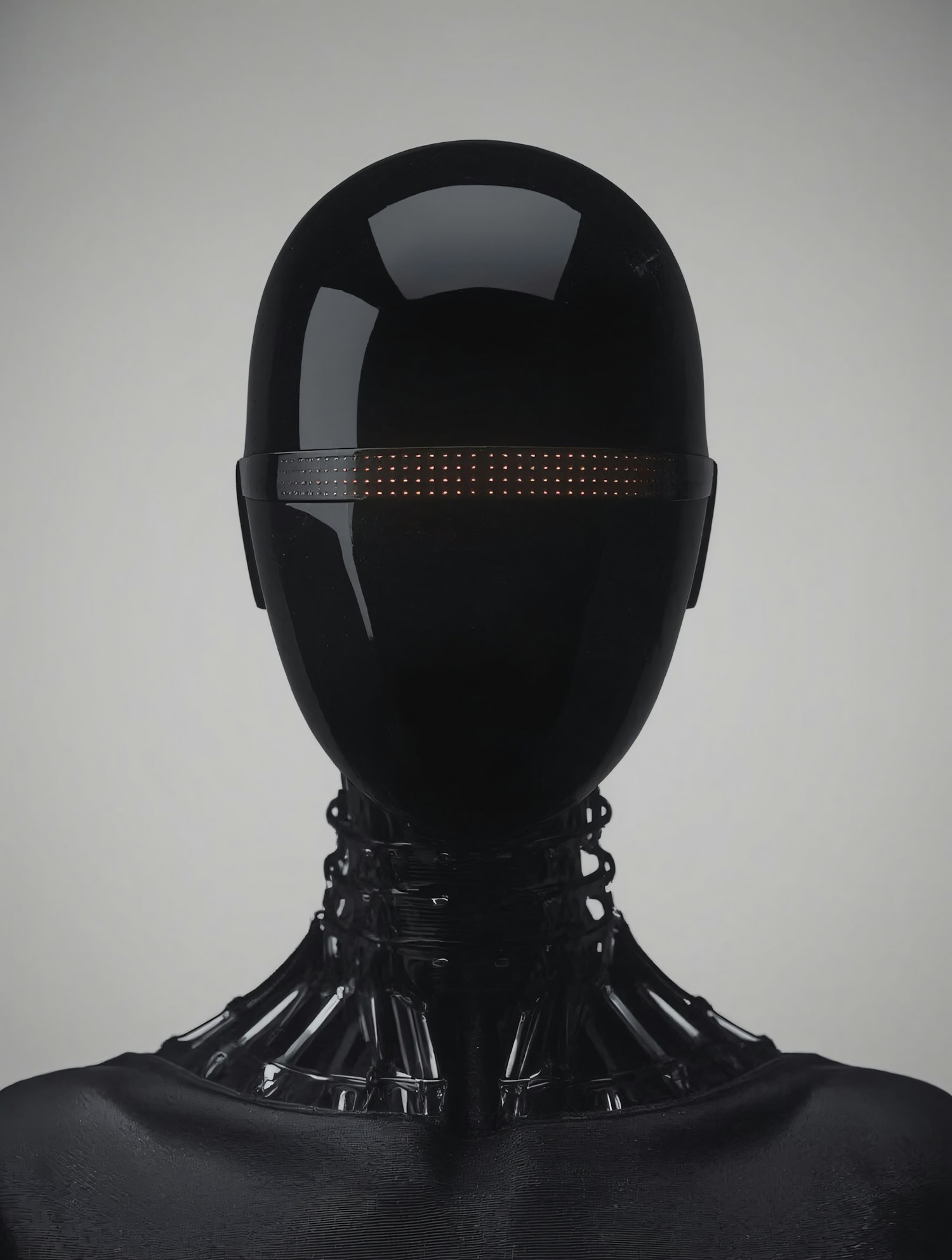 Sleek black humanoid robot with a reflective head and intricate mechanical neck design, set against a neutral background.