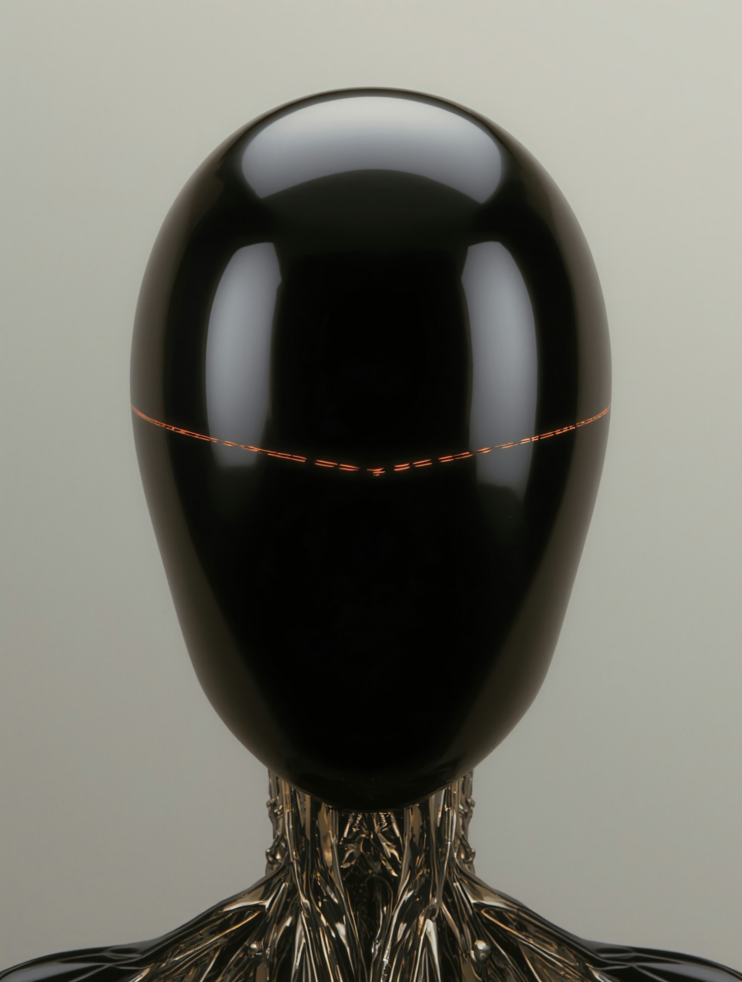 Futuristic humanoid robot with a glossy black head and intricate metallic neck design, featuring a red light line sensor.