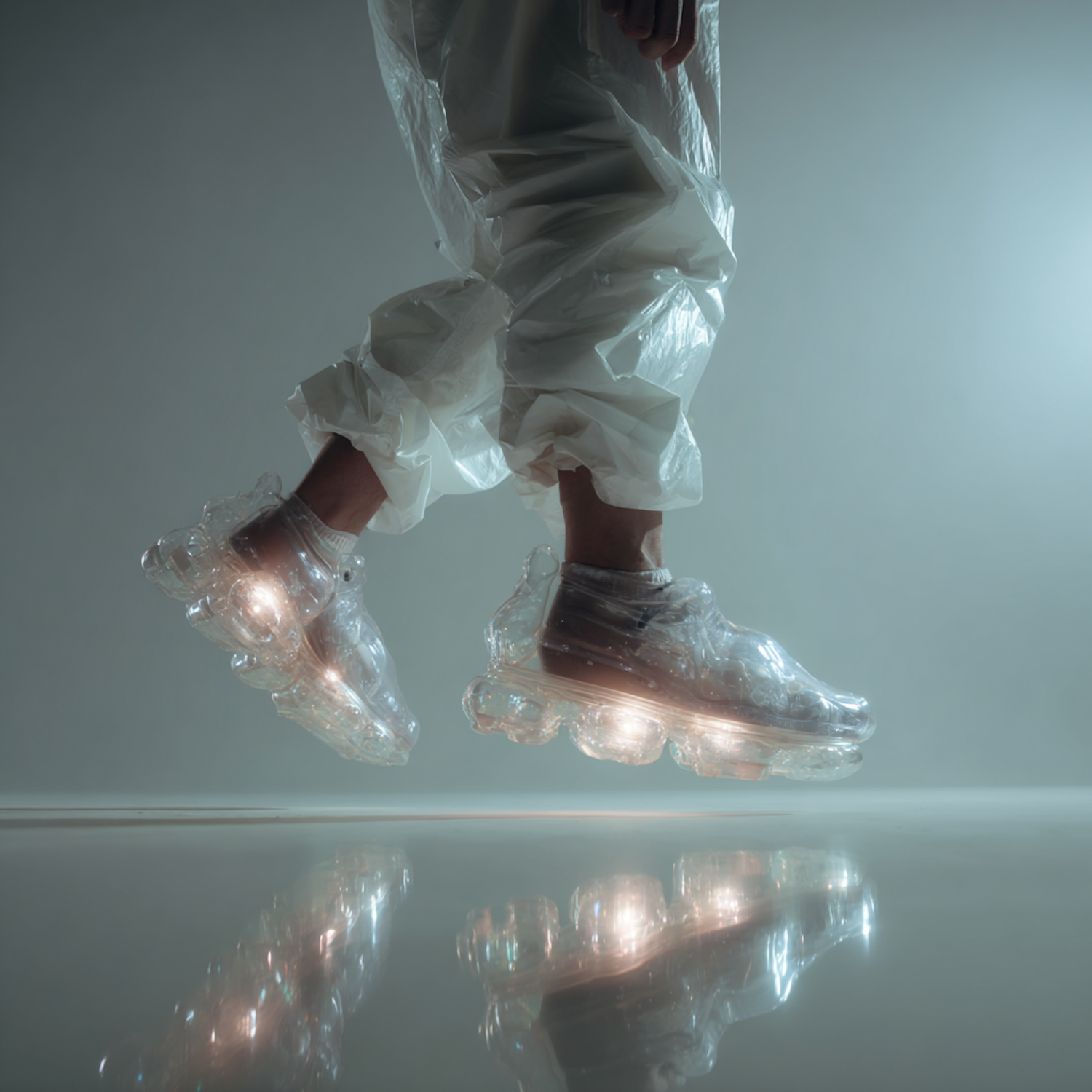 Futuristic transparent shoes with glowing soles, paired with white pants, captured in a minimalistic and reflective setting.