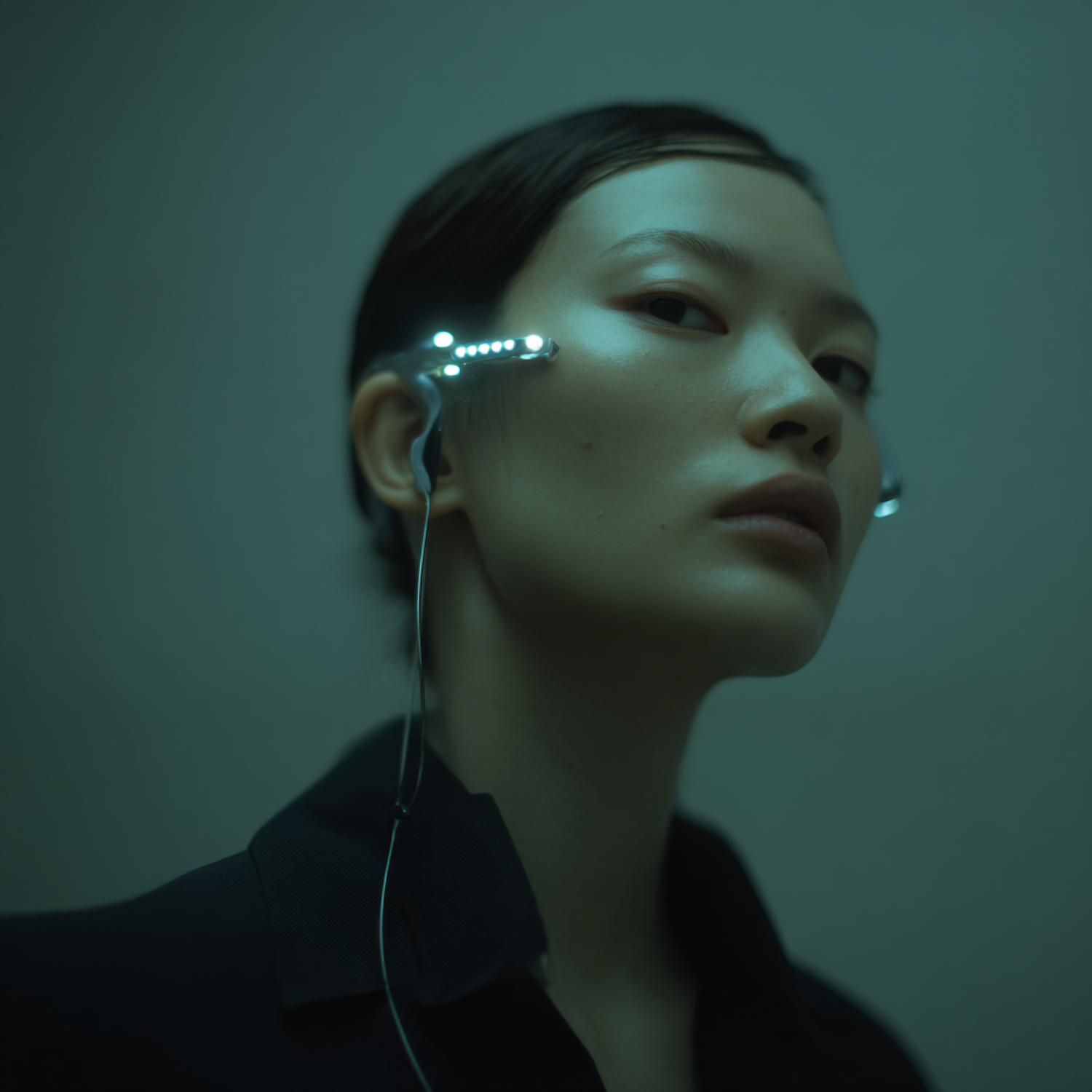 A futuristic portrait of a person wearing glowing tech accessories, set against a minimalistic background with a cool-toned ambiance.