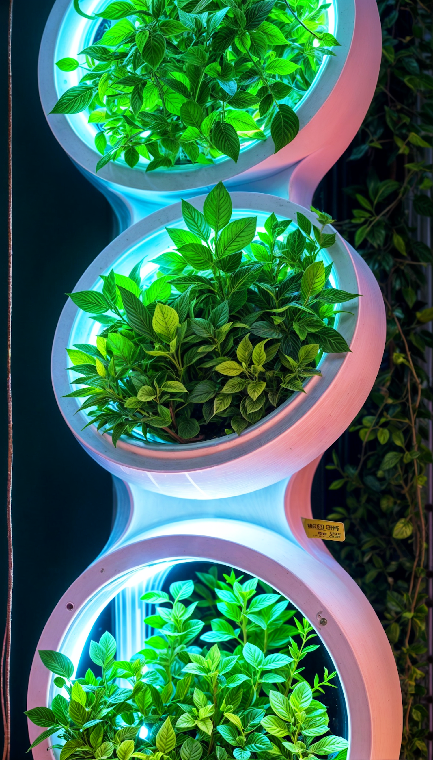 Vertical garden with three circular planters, lush green foliage, and blue lighting for a modern, artistic display.