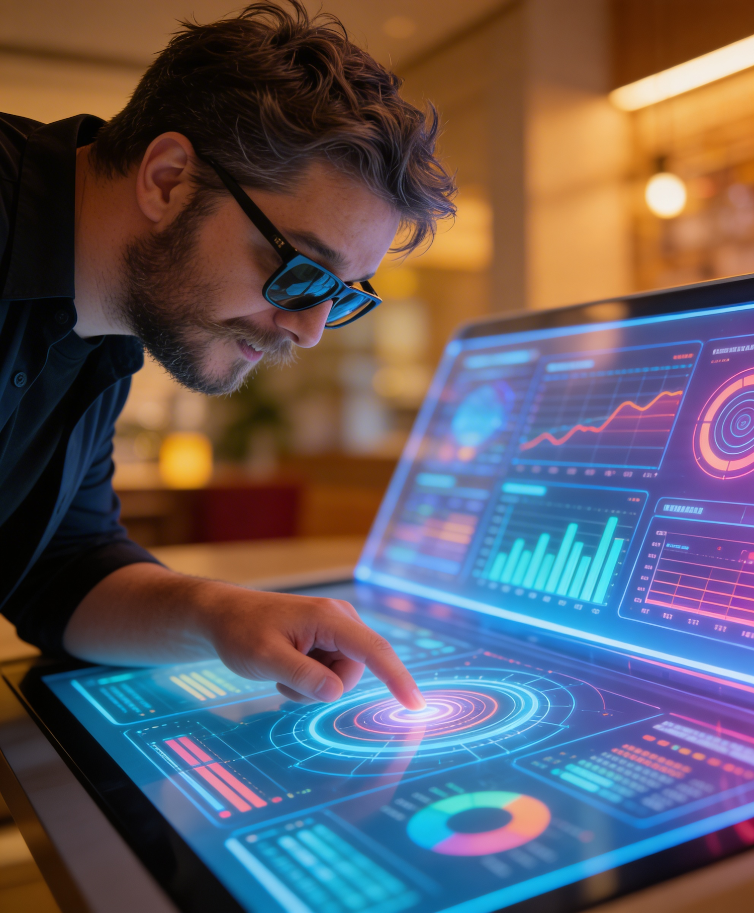 A man interacts with a futuristic touchscreen displaying vibrant data visualizations in a warmly lit indoor setting.