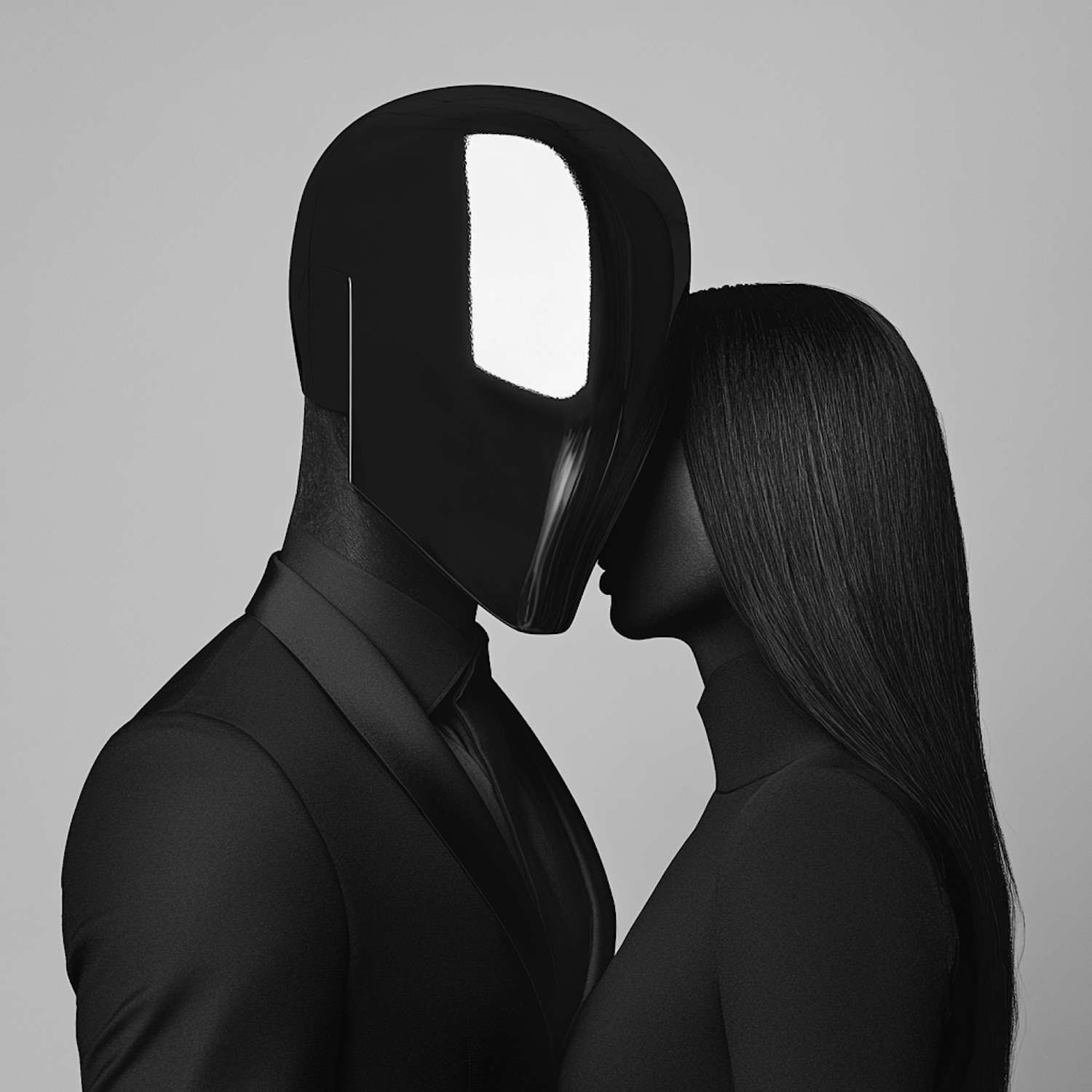 Surreal embrace of two black-clad figures, one with a glossy helmet, creating a futuristic and mysterious aesthetic.