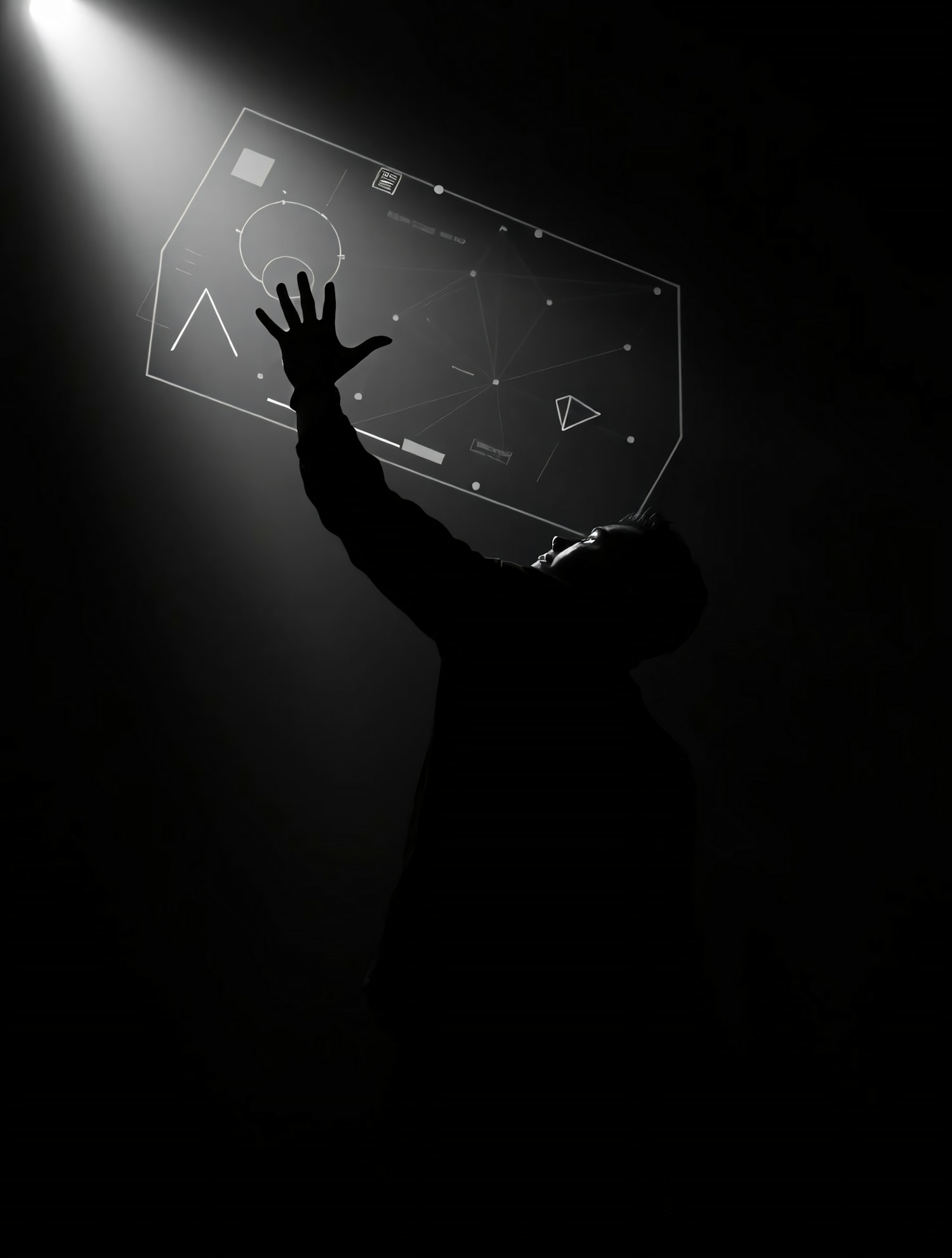 Silhouette of a person interacting with a glowing holographic interface in a dark setting, illuminated by a focused light beam.