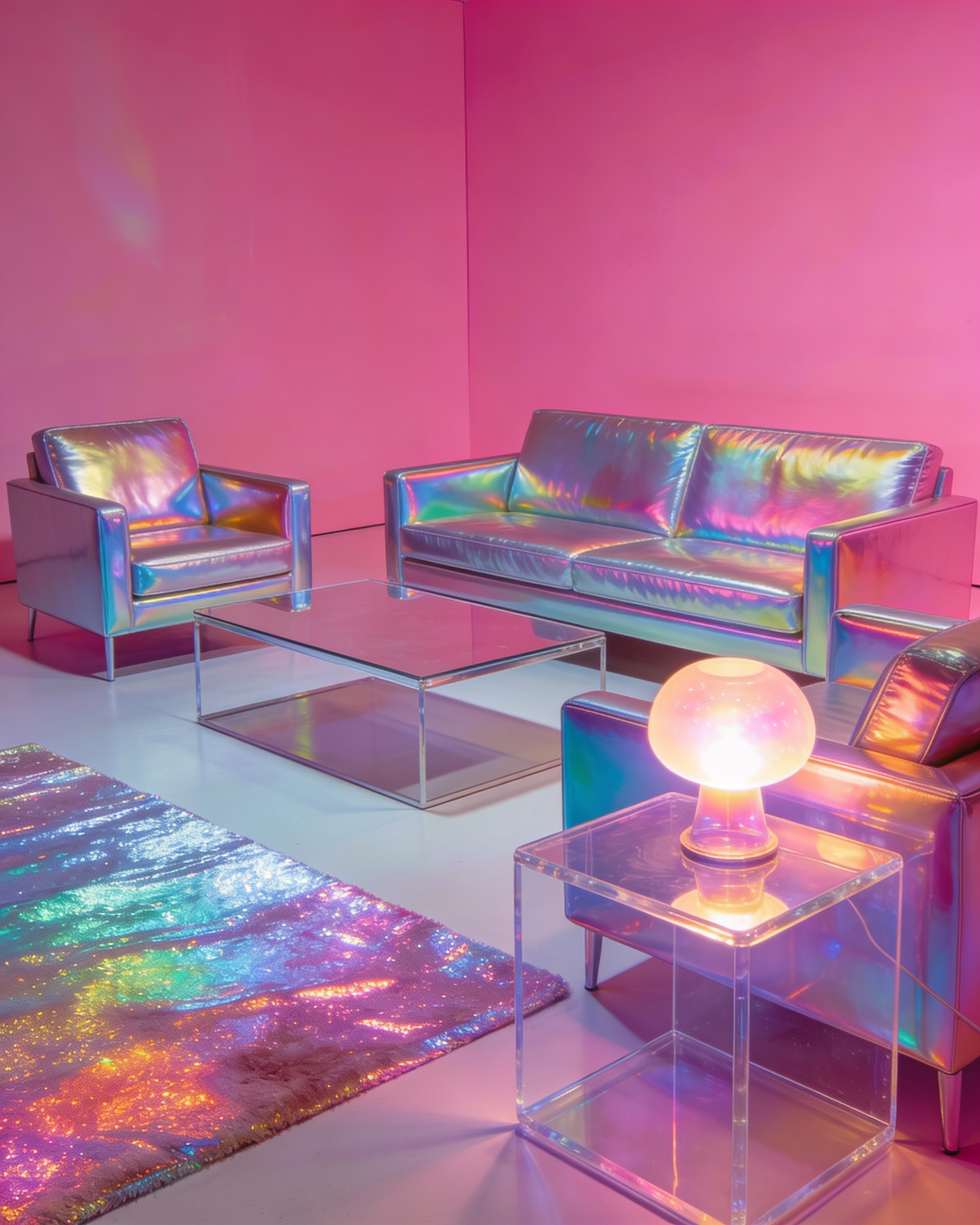 A living room full of holographic and iridescent furniture arranged neatly and shot inside a hot pink studio.