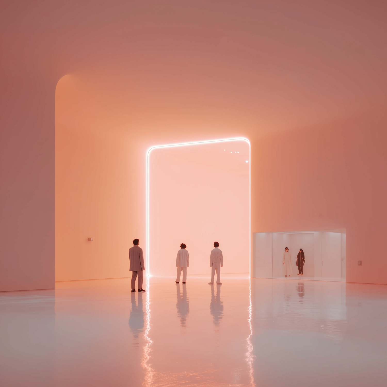 A futuristic, minimalistic room with glowing orange light, reflective floors, and people observing a large illuminated portal.