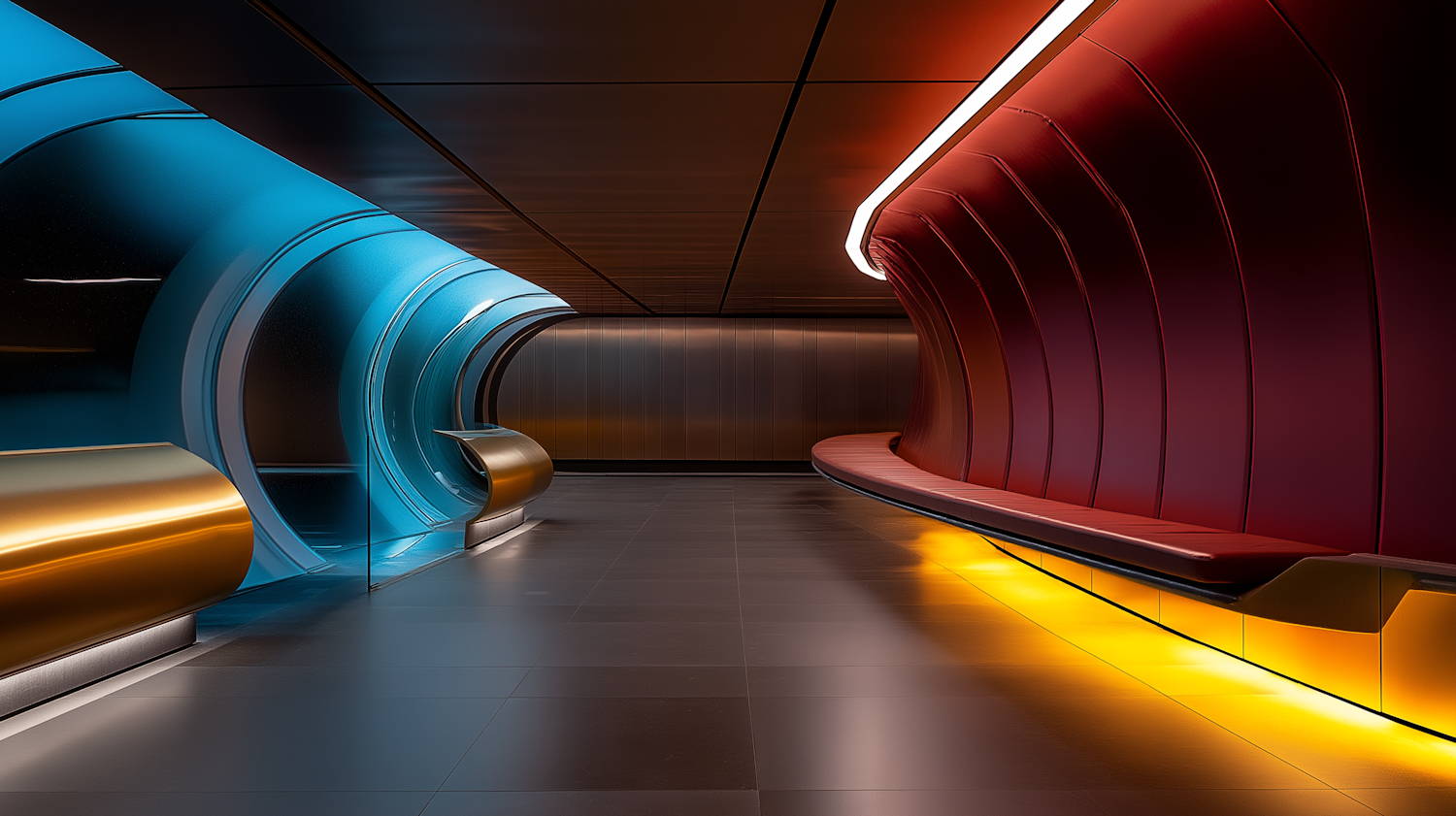 Futuristic corridor with sleek blue and red walls, golden benches, and vibrant lighting, creating a modern sci-fi atmosphere.