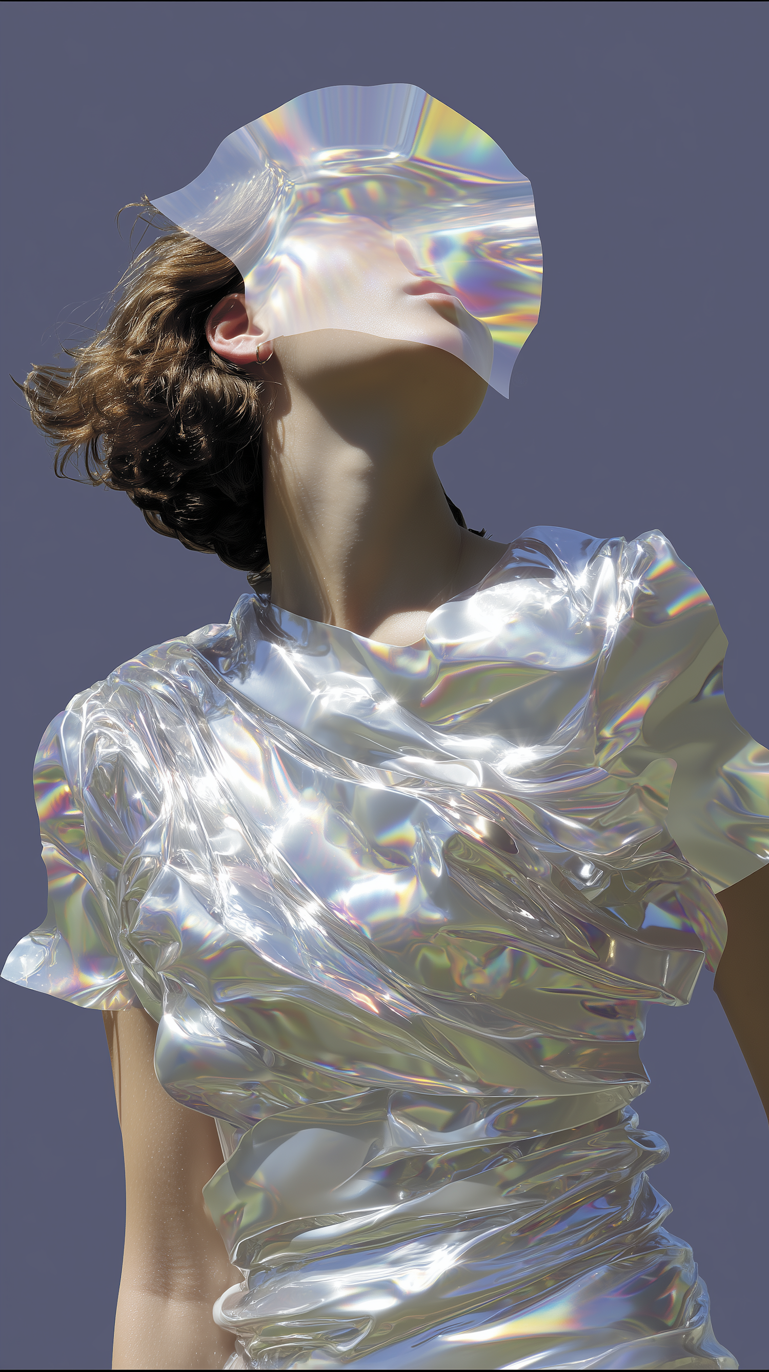 A person in iridescent attire with a translucent material over their face, set against a muted background, creating a futuristic vibe.