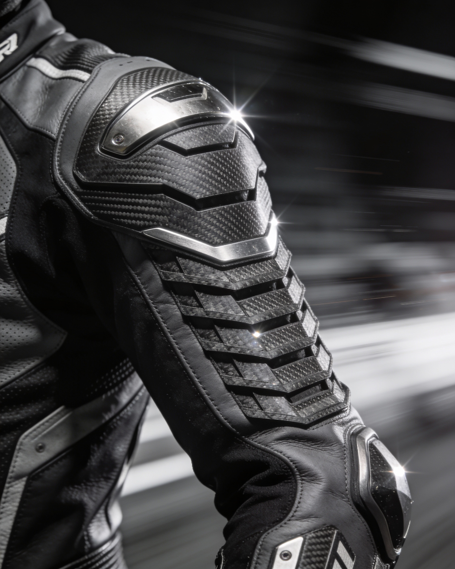 Close-up of a high-tech motorcycle jacket arm with carbon fiber and metallic accents, showcasing its protective and stylish design.