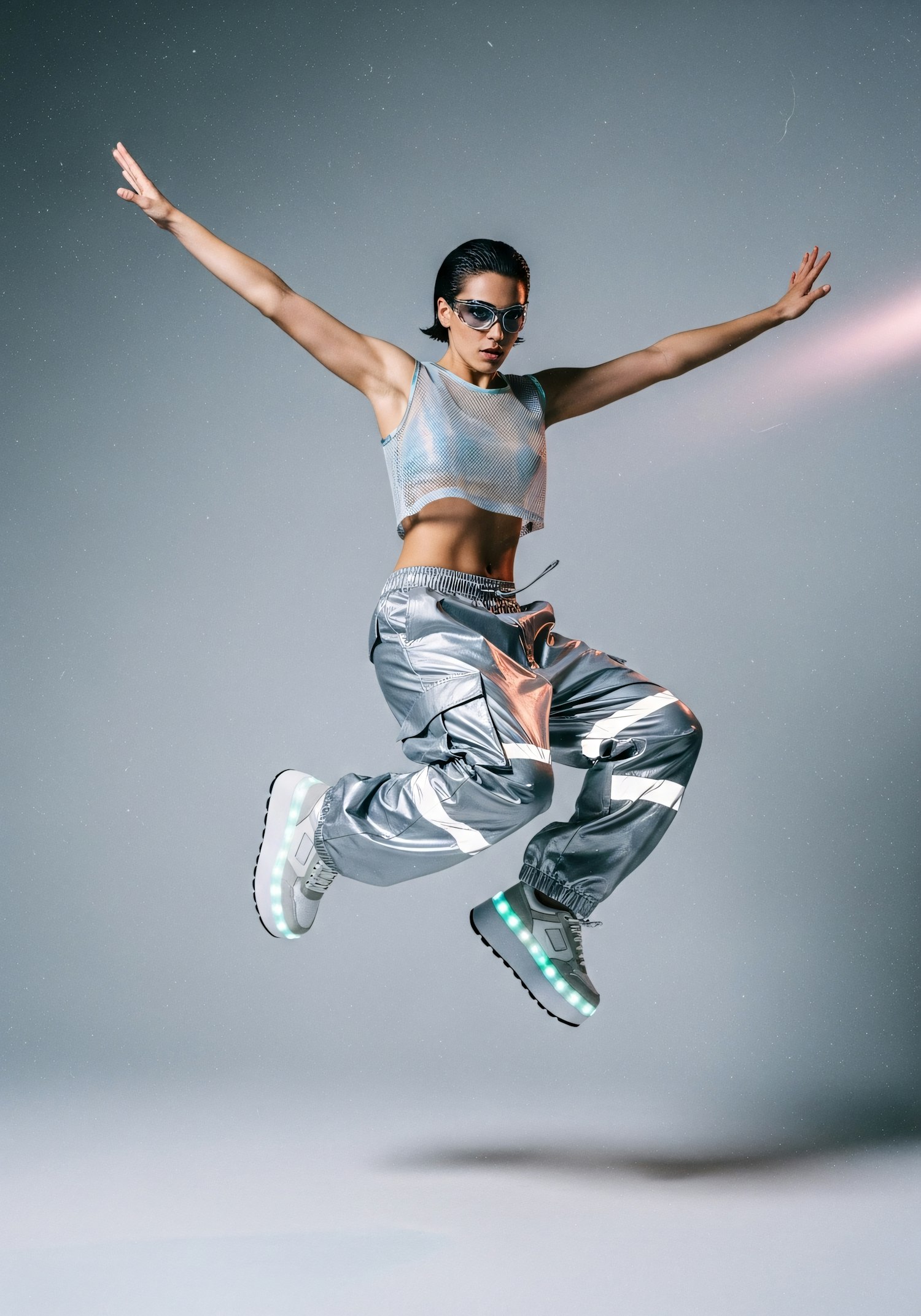 A person in a futuristic outfit jumps dynamically, wearing reflective pants, a metallic crop top, and glowing sneakers.