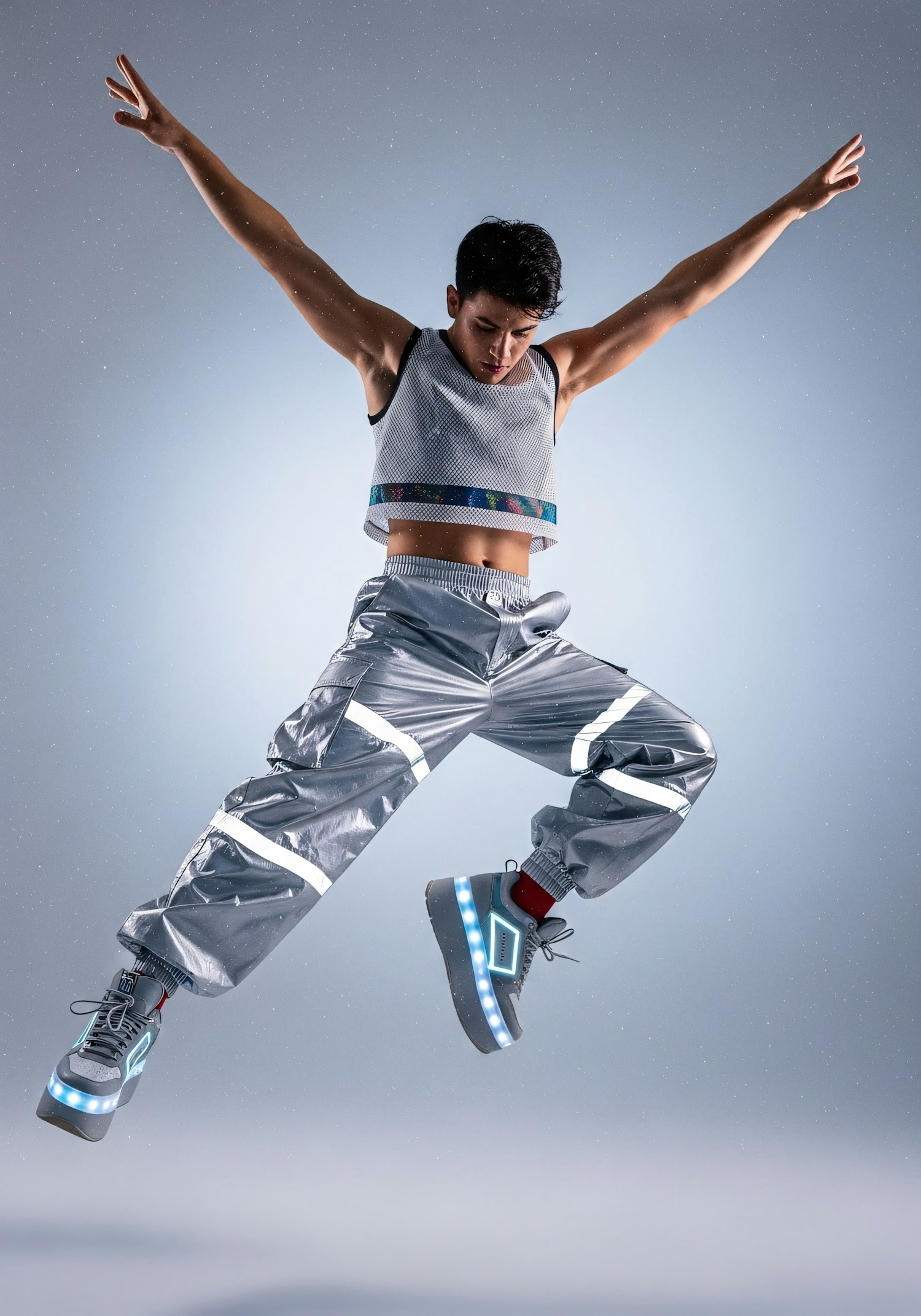 A person in reflective silver pants and glowing platform shoes jumps dynamically against a neutral background, showcasing futuristic fashion.