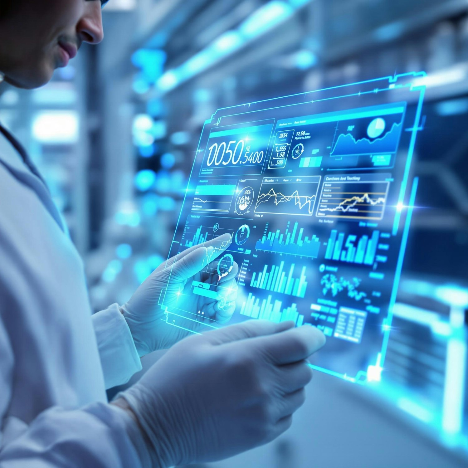 Scientist in a lab using a glowing blue futuristic digital interface with data charts and graphs, showcasing advanced technology.
