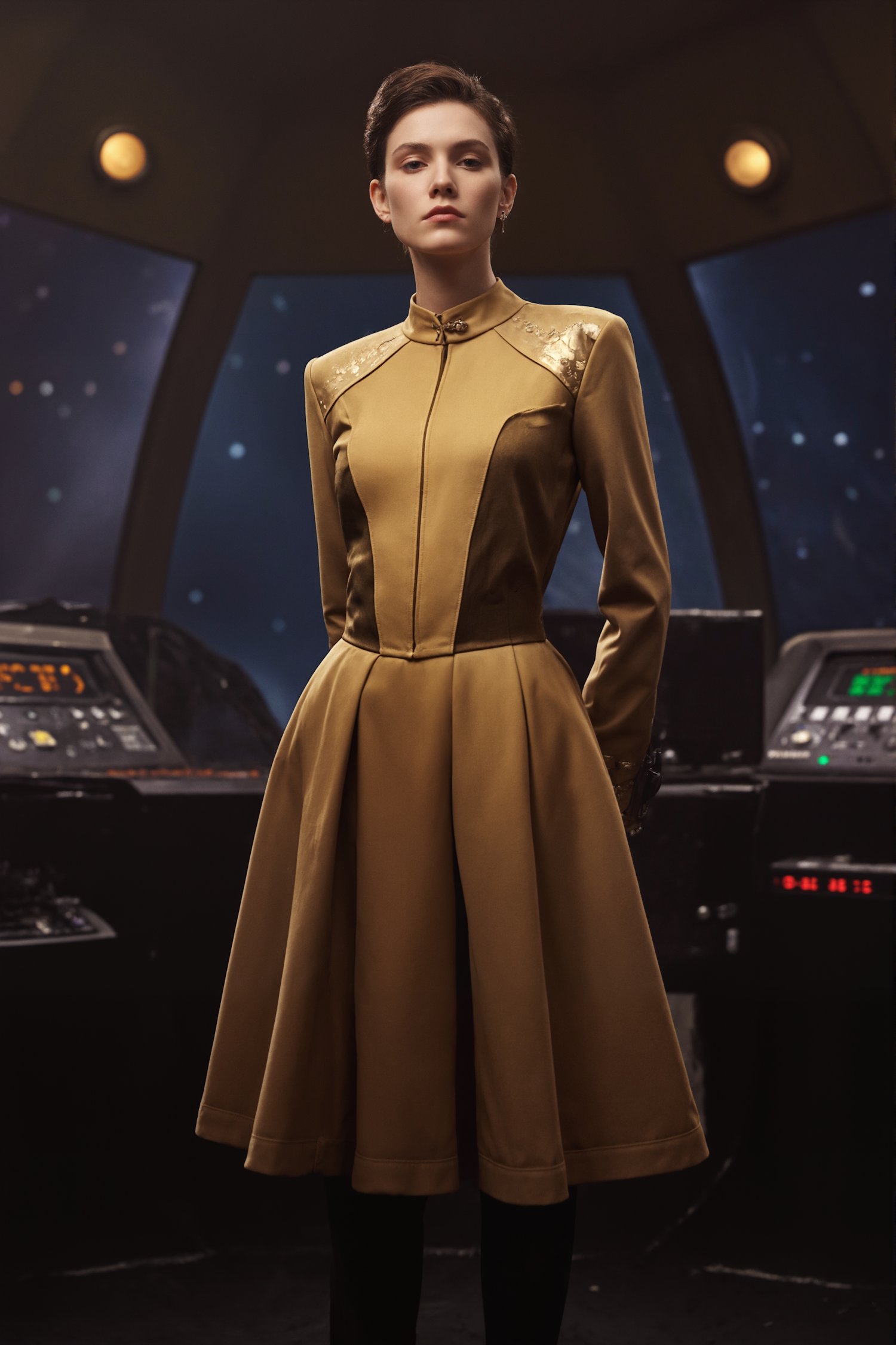 A woman in a gold uniform stands in a futuristic spaceship setting, with control panels and a starry backdrop adding a sci-fi vibe.