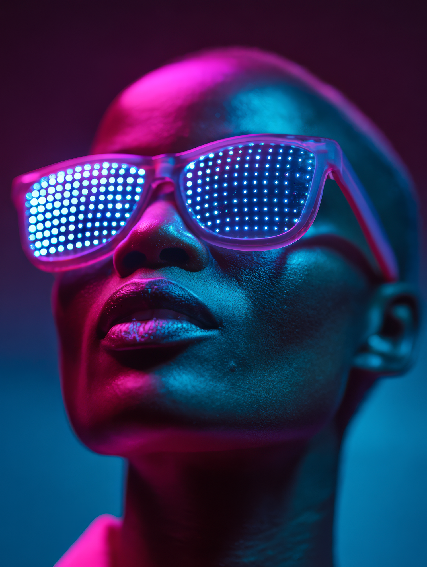 Close-up of a person wearing LED glasses, illuminated by vibrant pink and blue lighting, creating a futuristic and stylish vibe.