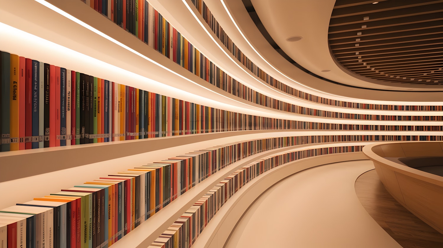 A stunning modern library with curved, illuminated bookshelves filled with colorful books, warm lighting, and sleek wooden accents.