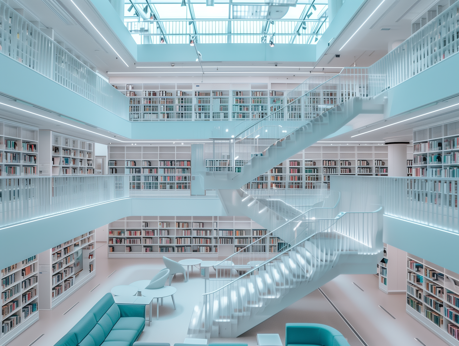 Modern library with sleek design, white and blue color scheme, glass ceiling, and illuminated staircases. Spacious and inviting.