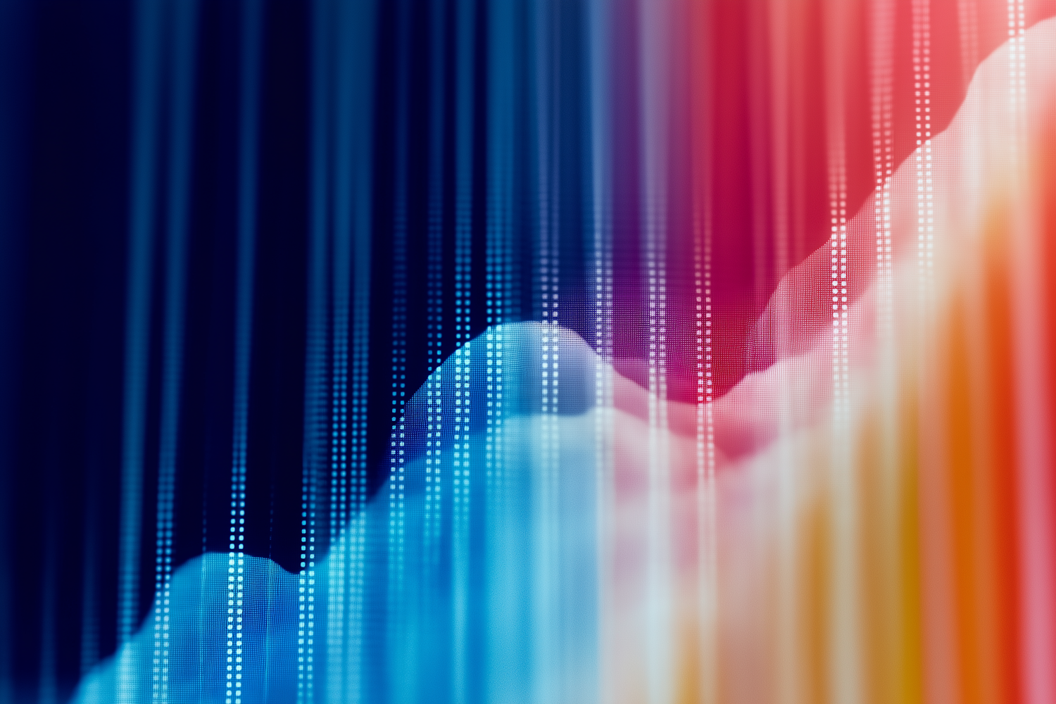 Abstract digital art with vibrant vertical lines, dotted patterns, and cloud-like shapes in blue, red, and orange hues.