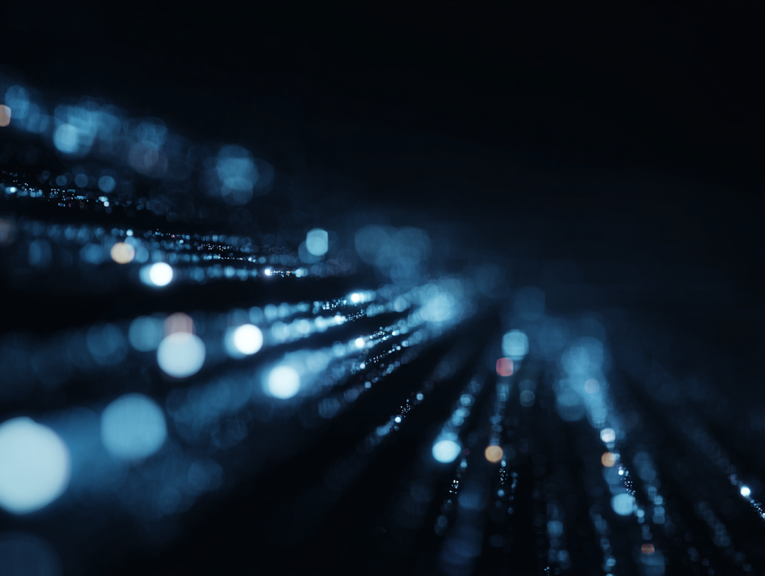 Abstract bokeh lights in blue tones create a futuristic and cosmic atmosphere, with a sense of depth and motion.