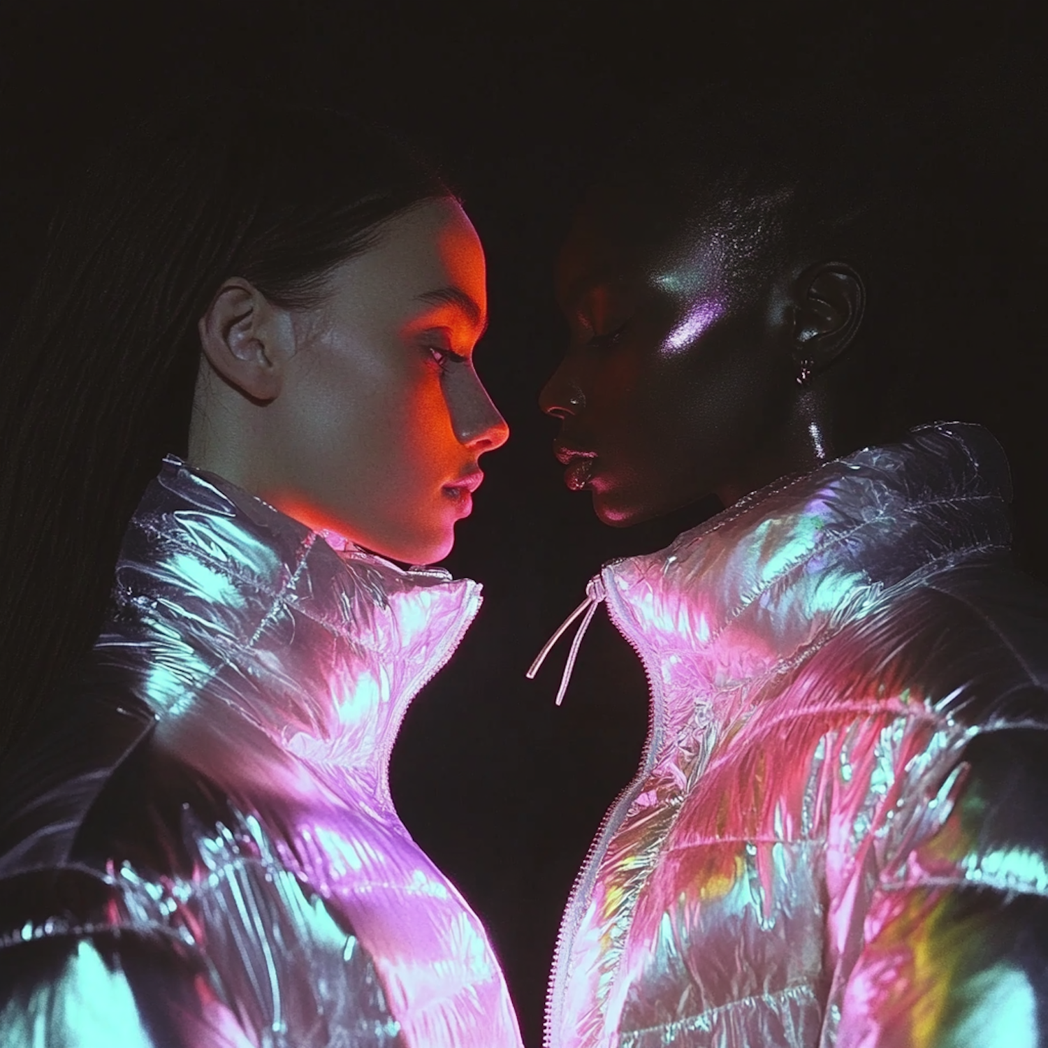 Two women in iridescent puffer jackets face each other under dramatic lighting, creating a futuristic and artistic vibe.