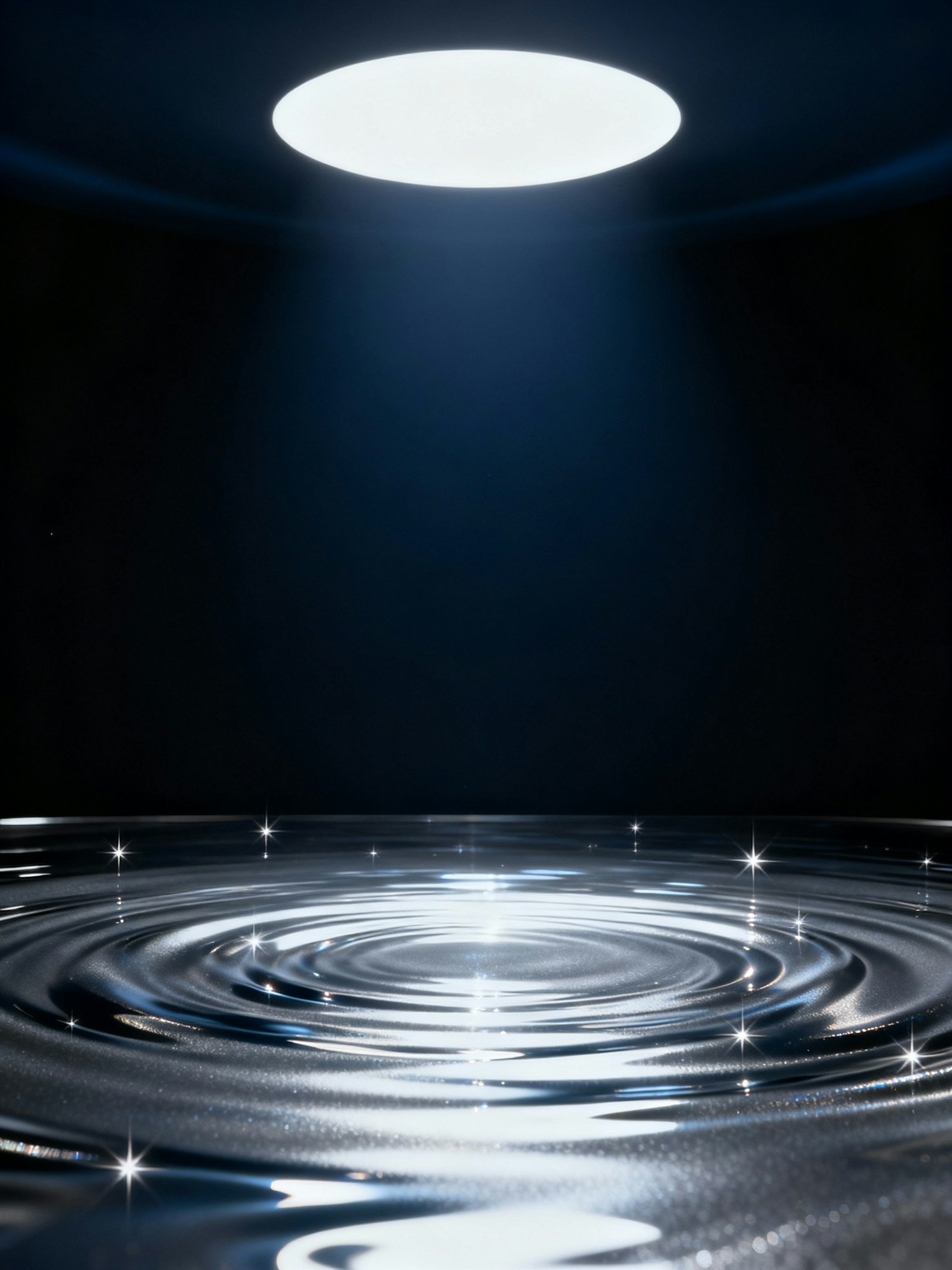 A glowing circular light illuminates rippling water in a dark setting, creating a serene and futuristic ambiance with shimmering highlights.