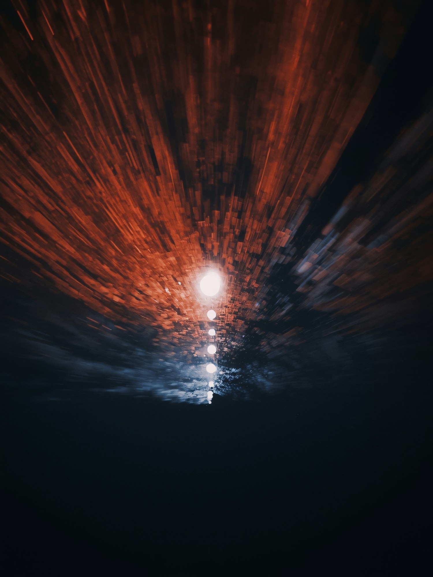 Abstract image of aligned lights with a dynamic red and blue streaked background, creating a futuristic and surreal visual effect.