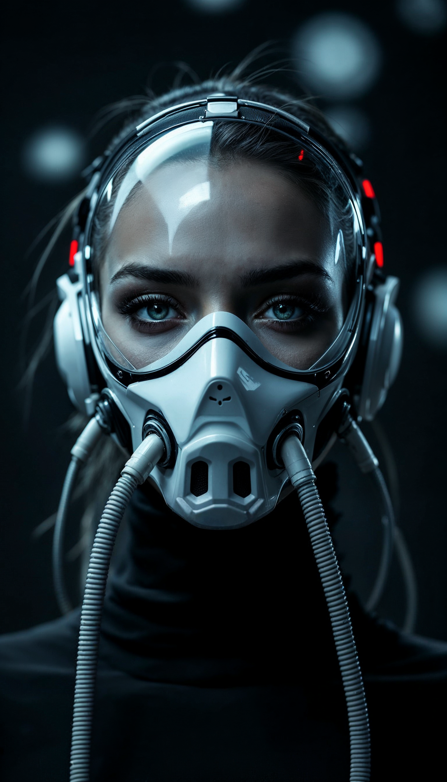Futuristic woman with blue eyes wearing a high-tech helmet and breathing mask, set against a dark background with blurred lights.