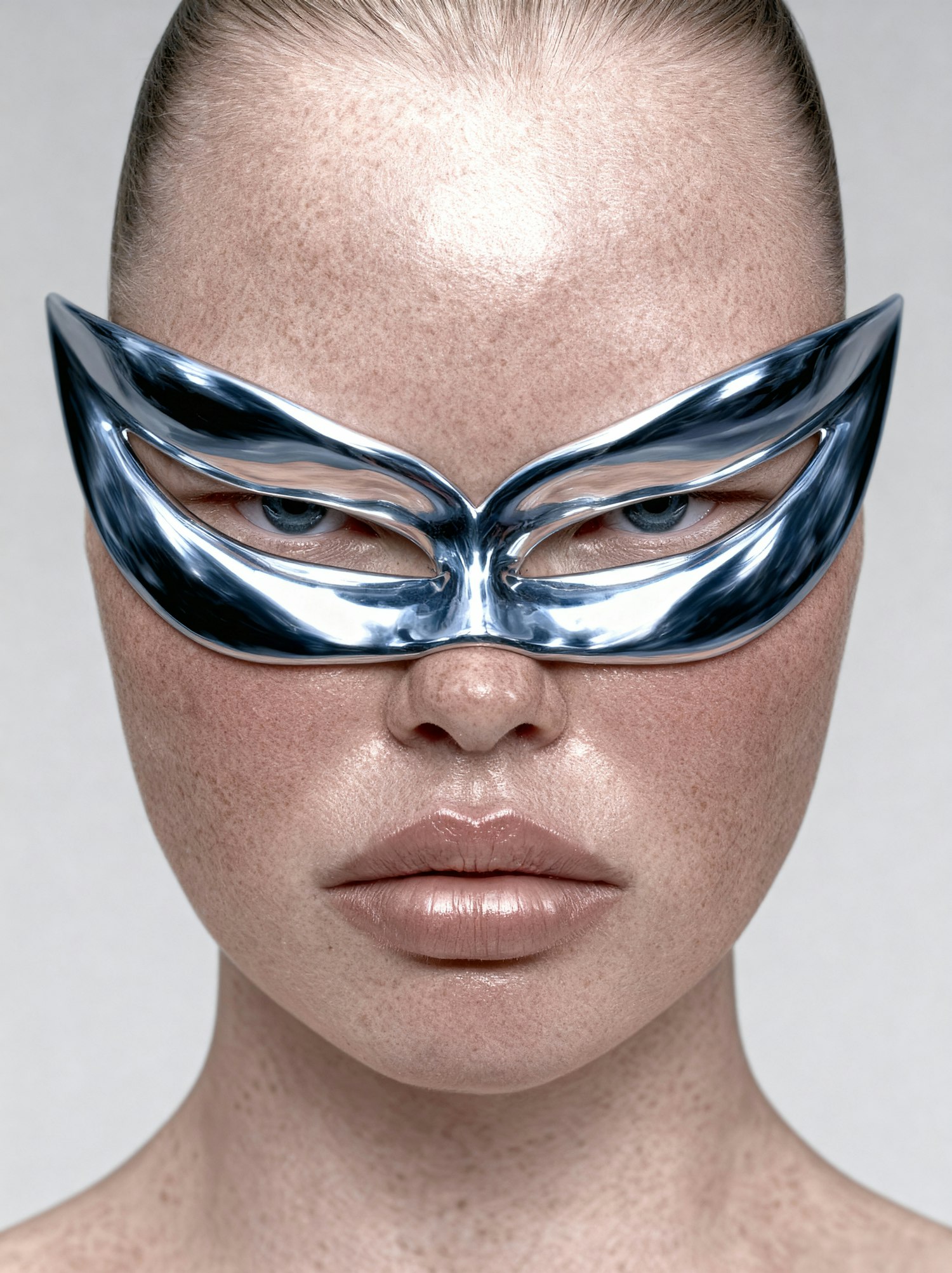 Close-up of a person with a futuristic silver mask, fair freckled skin, and glossy lips, set against a neutral background.