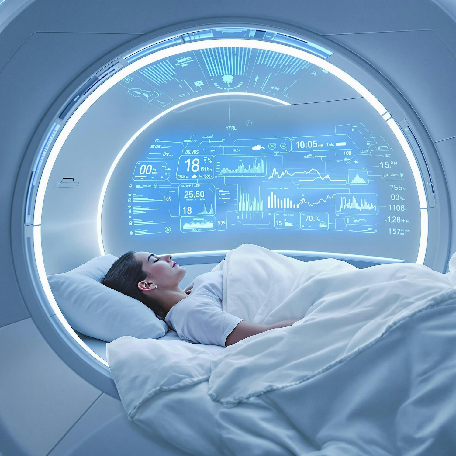 A woman lies in a futuristic scanner with holographic health data displayed, showcasing advanced medical technology and real-time monitoring.