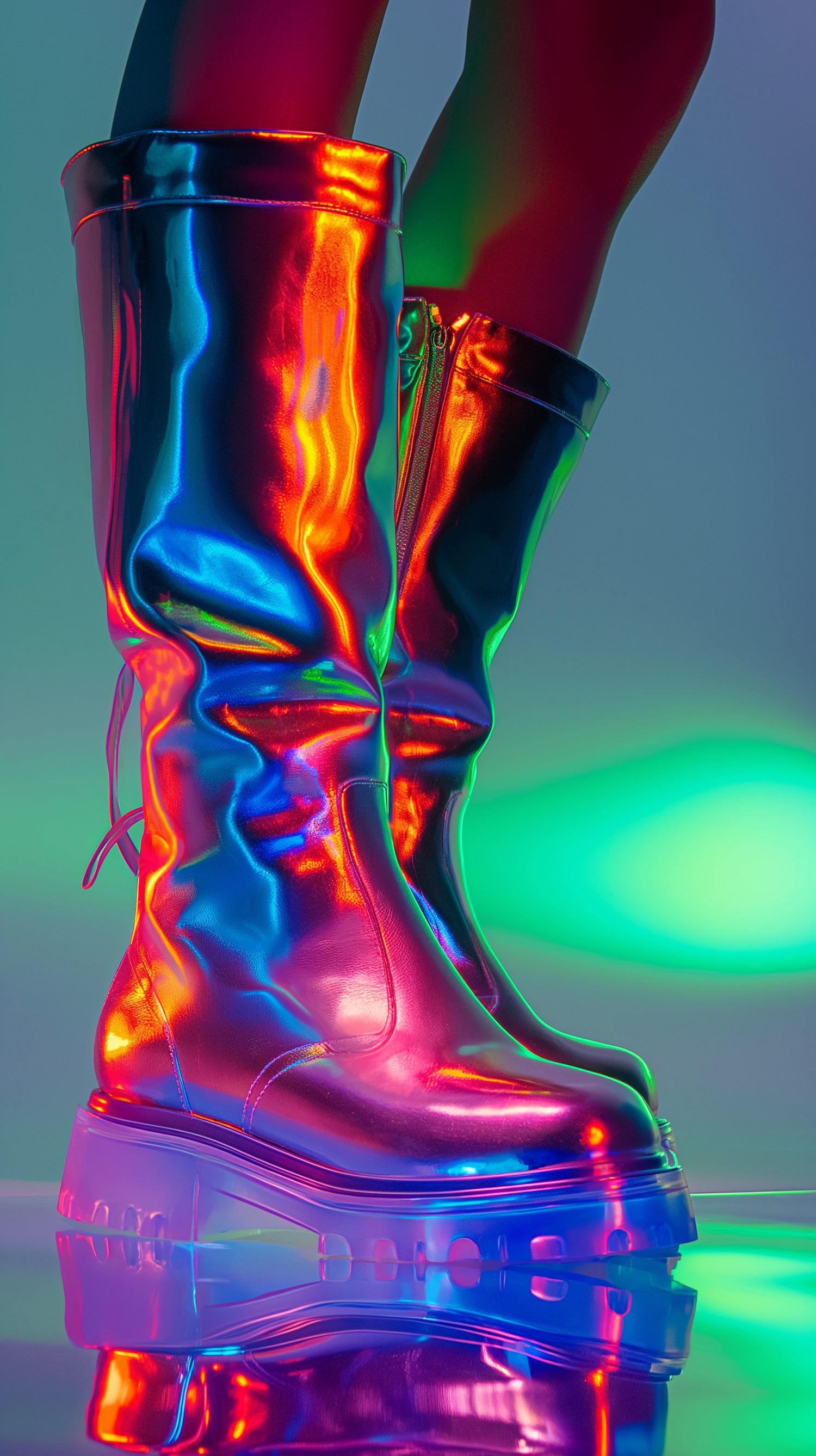 Futuristic iridescent boots with vibrant reflections and a thick transparent sole, set against a colorful gradient background.