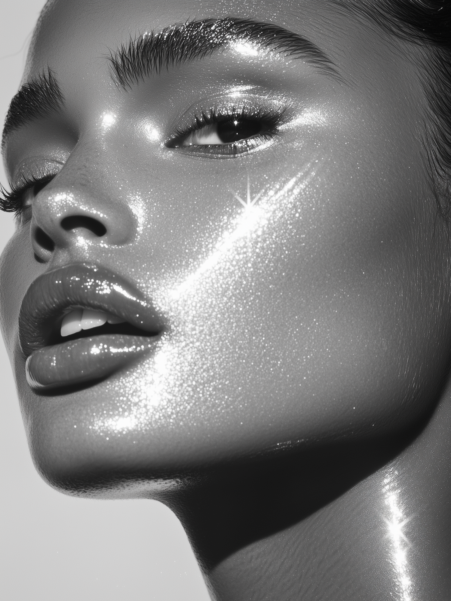 Close-up black and white image of a glossy, shimmering face with full lips and defined eyebrows, exuding a high-fashion aesthetic.