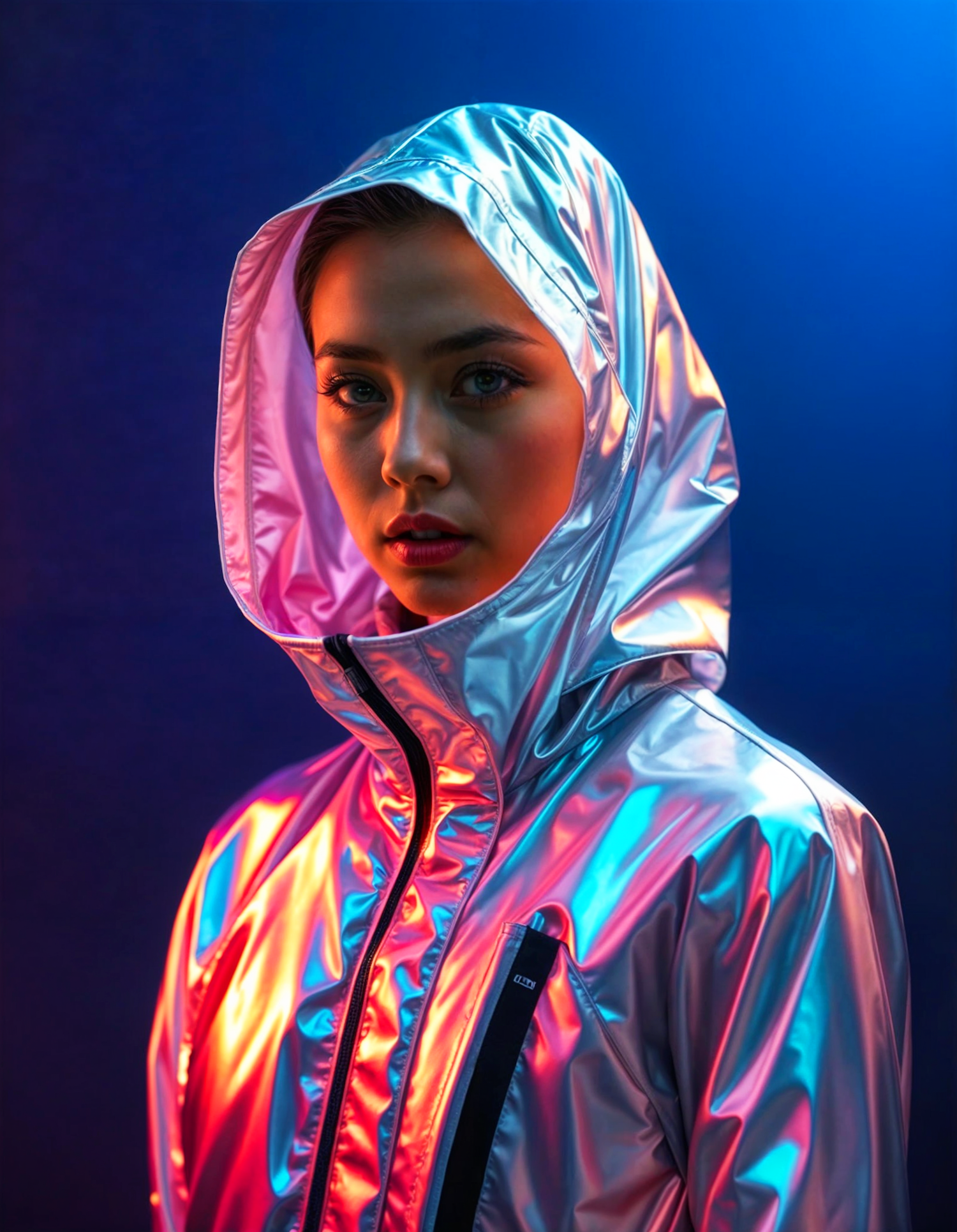 A woman in a reflective silver hooded jacket with vibrant lighting in pink, blue, and orange, creating a futuristic aesthetic.