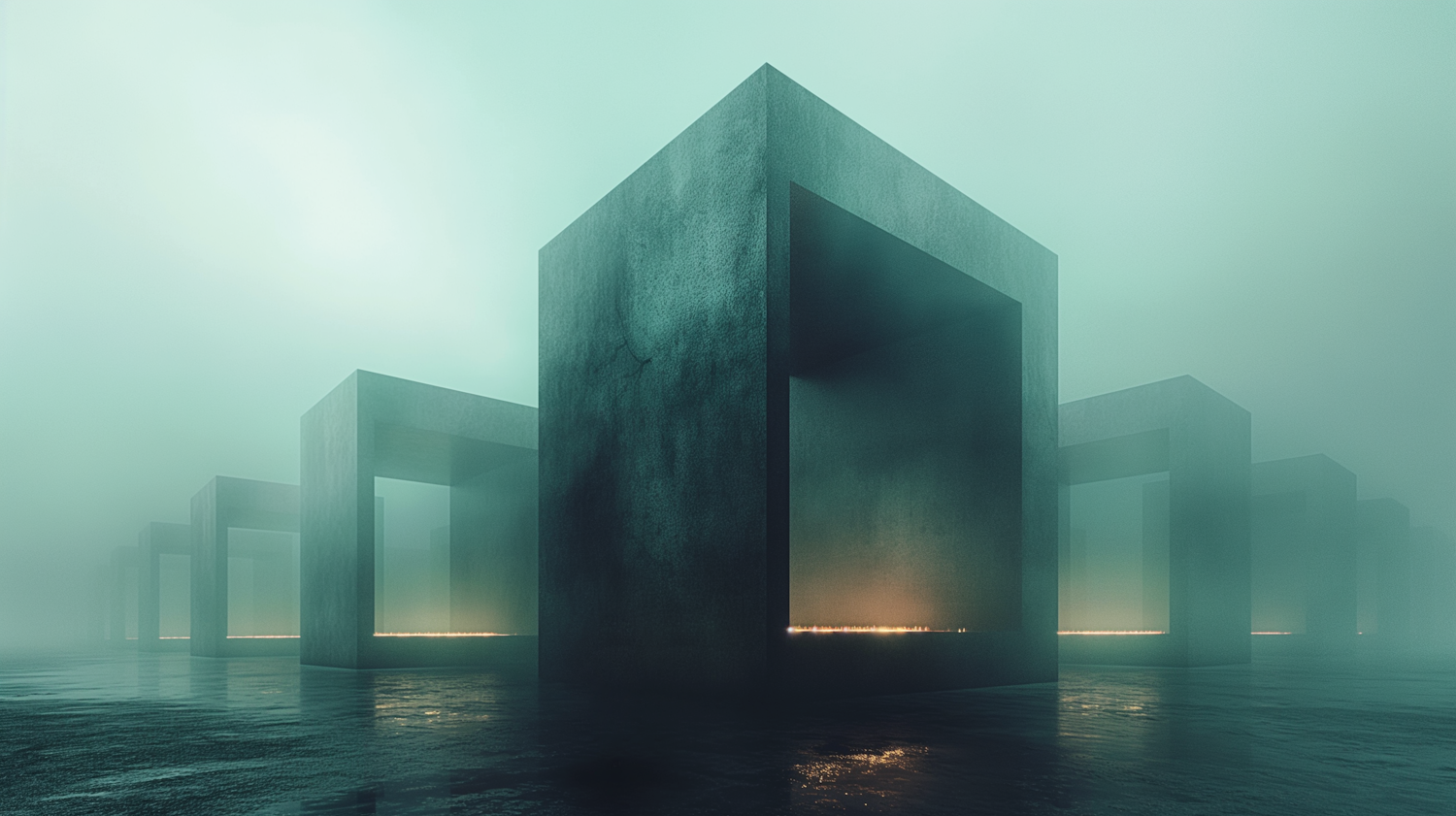 Mysterious geometric structures in a foggy landscape with ambient lighting and reflective surfaces, creating an ethereal atmosphere.