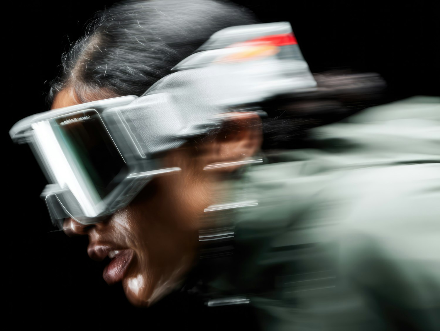 A person wearing futuristic goggles in a motion-blurred image, emphasizing speed and energy against a dark background.