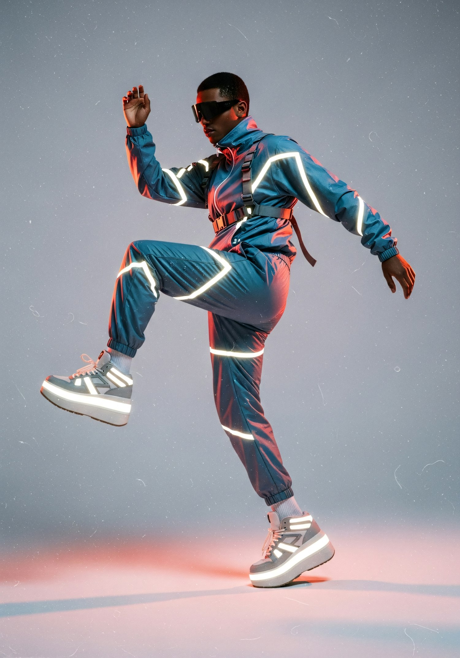 A person in a reflective blue jumpsuit and platform sneakers poses dynamically against a gradient background.