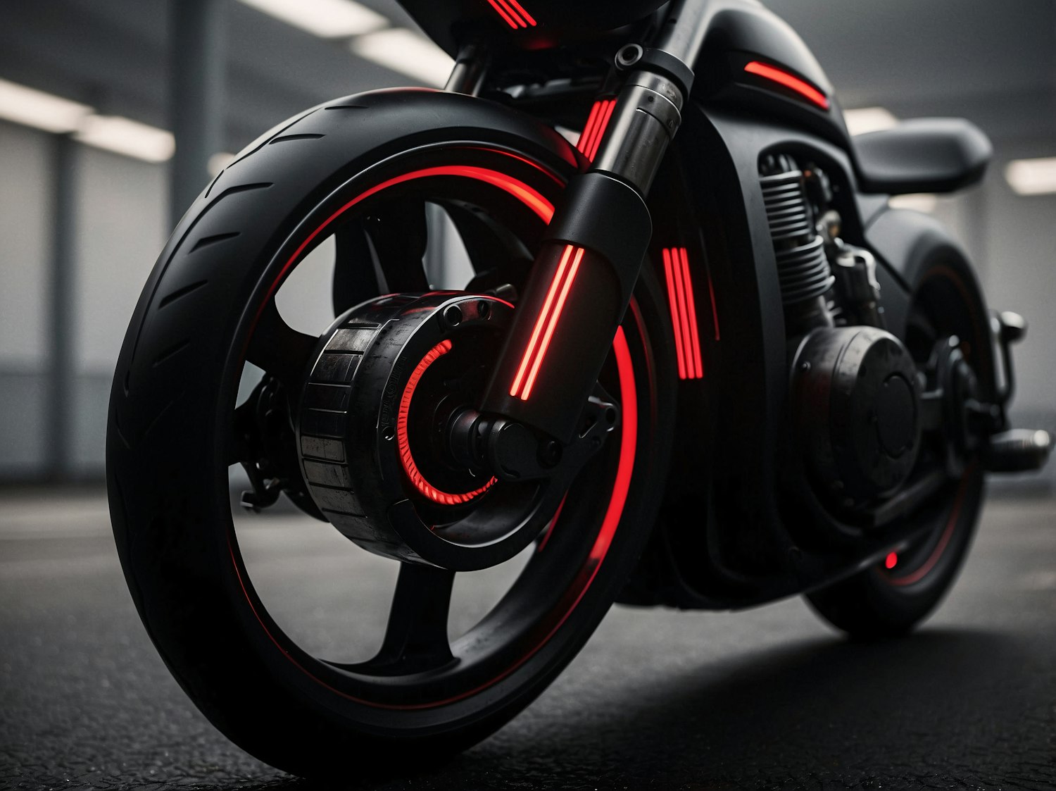 Futuristic black motorcycle with red LED accents on the wheel and suspension, showcasing sleek design and high performance.