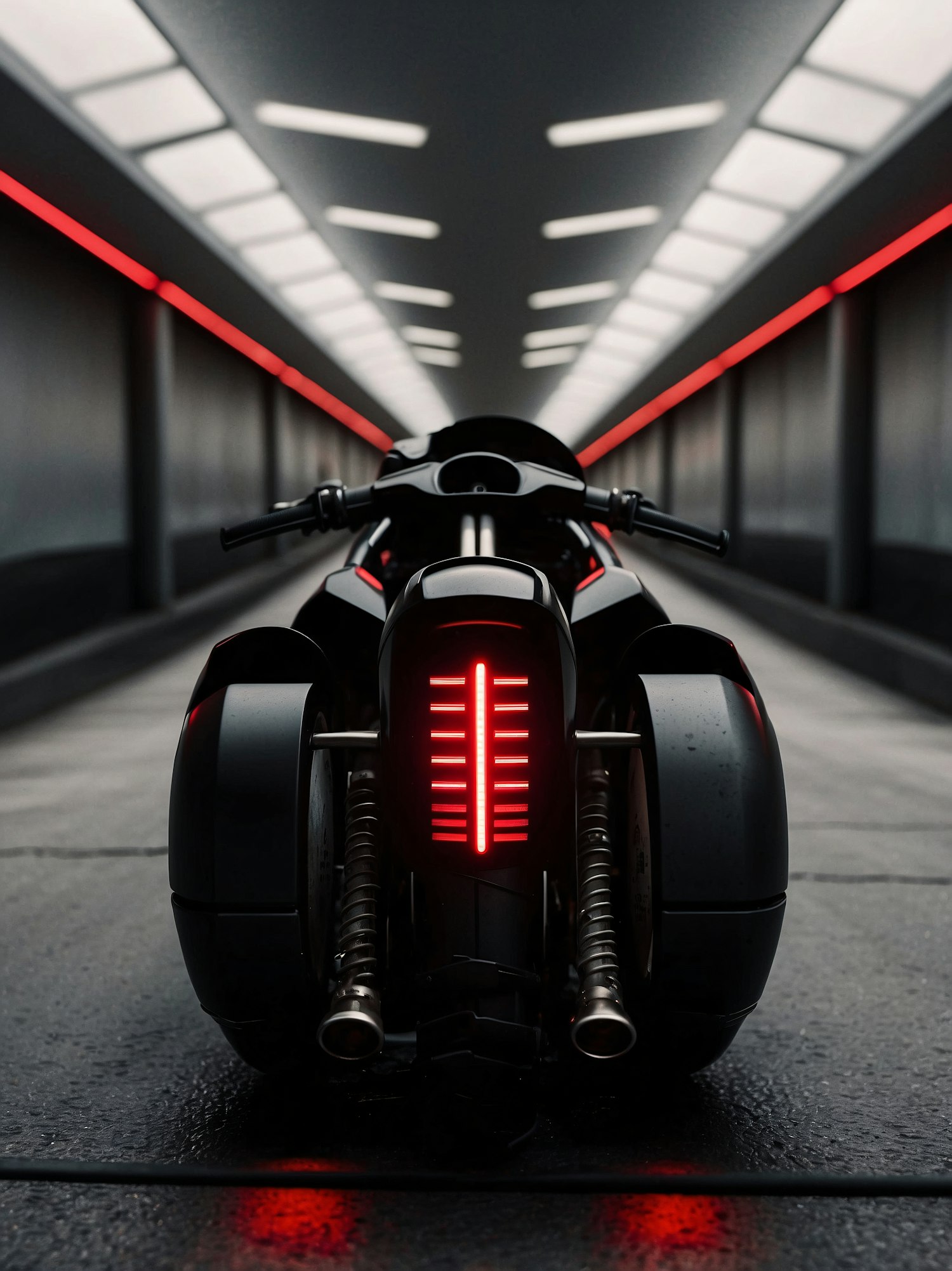 Futuristic black motorcycle with red LED lights in a dimly lit tunnel, creating a sleek and modern atmosphere.