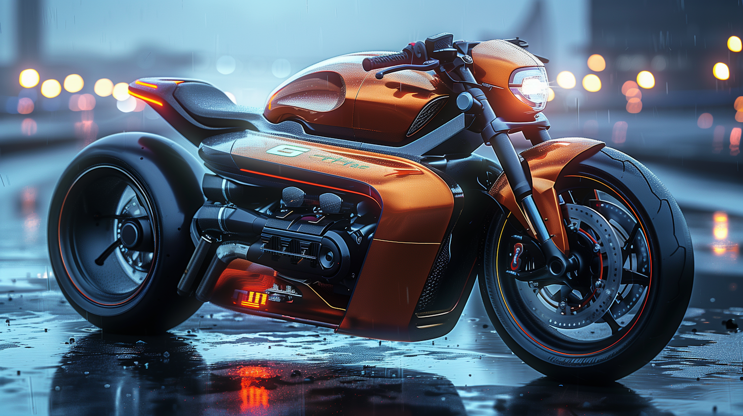 Futuristic orange motorcycle on wet pavement with glowing headlight and blurred city lights in the background.